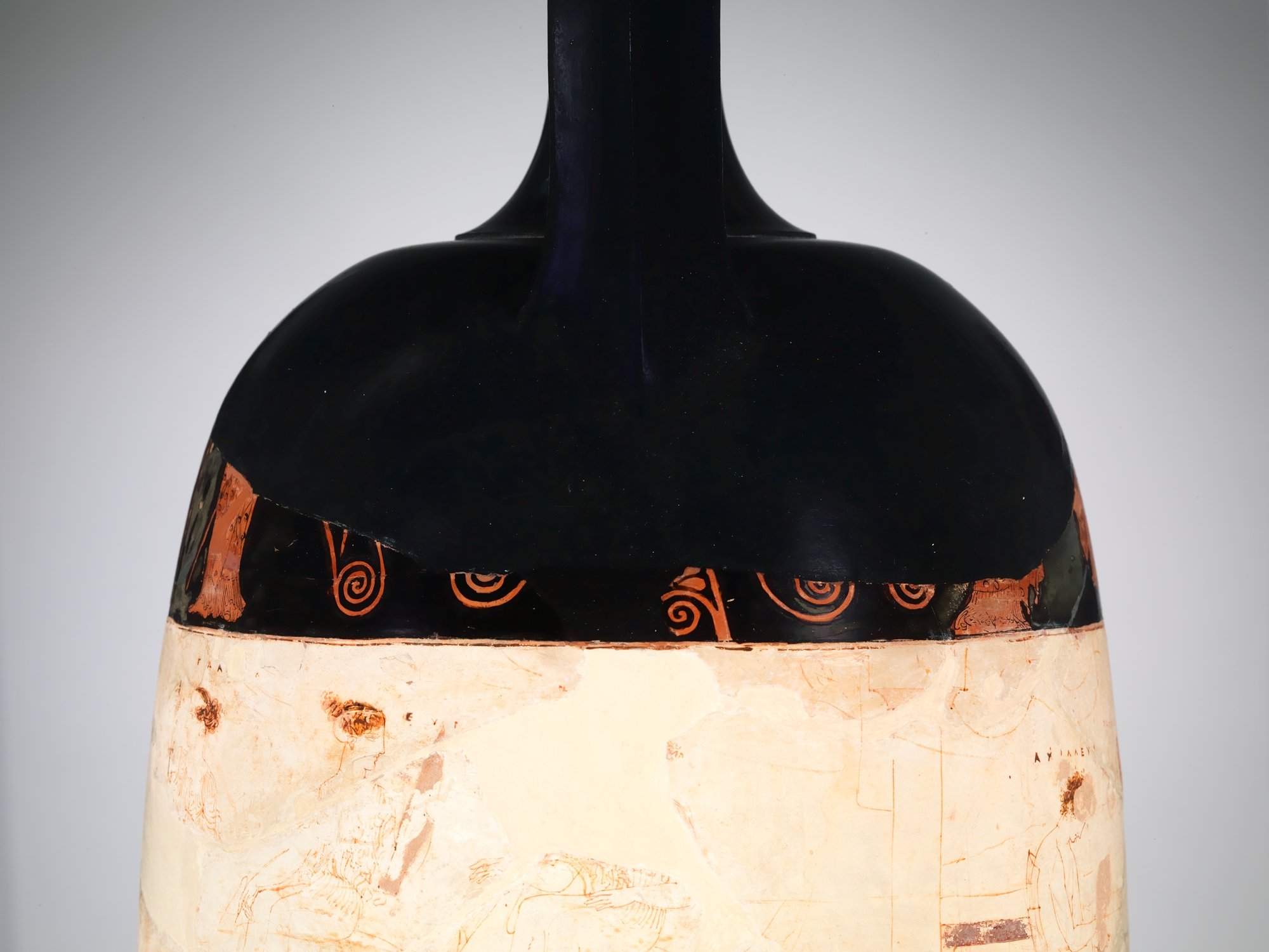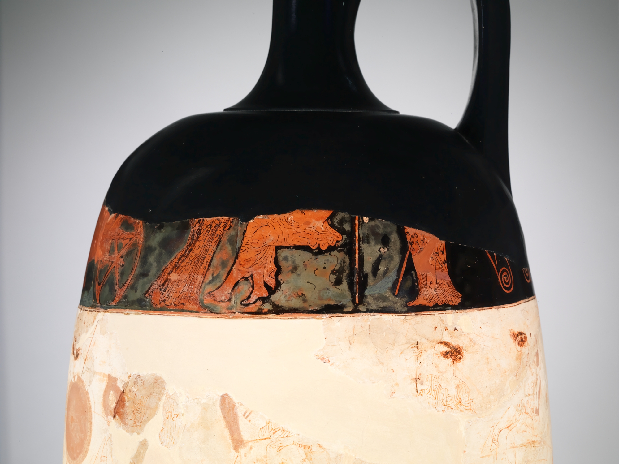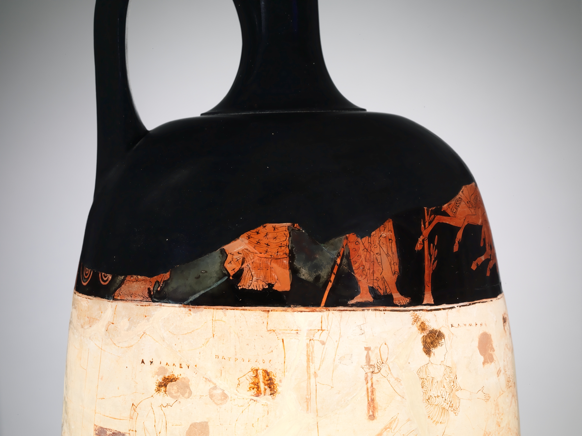 This lekythos is of exceptional novelty and beauty. The unusually large shape is subdivided into three zones, each with a mythological subject. The middle zone features Thetis and her sister Nereids bringing armor to replace the set that Achilles had given Patroklos. The lower zone depicts Theseus and Hippolyte in combat among Greeks and Amazons. In both cases, the subject concerns a woman in martial mode and a warrior. The uppermost scene has been interpreted as the abduction of Persephone but more likely shows a god (or goddess) departing on a mission of divine intervention. The placement of the white-ground zone between two in red-figure emphasizes the Eretria Painter's extraordinary draftsmanship. It may also indicate the funerary purpose of the vase.