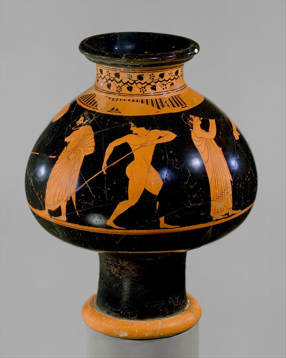 These fragments adjoin 10.210.18 whose description is the following: The name of each figure is inscribed: the flute player, Smikythos; the diskos thrower, Antiphanes, and his trainer, Antimenes; the broad jumper, Dorotheos ("he is going to jump"); the javelin thrower, Batrrachos; Kleainethos, the judge crowning the boy fair Epainetos, and his trainer, Alketes. Two inscriptions refer to the vase itself: "drink me" and "I open my mouth wide."