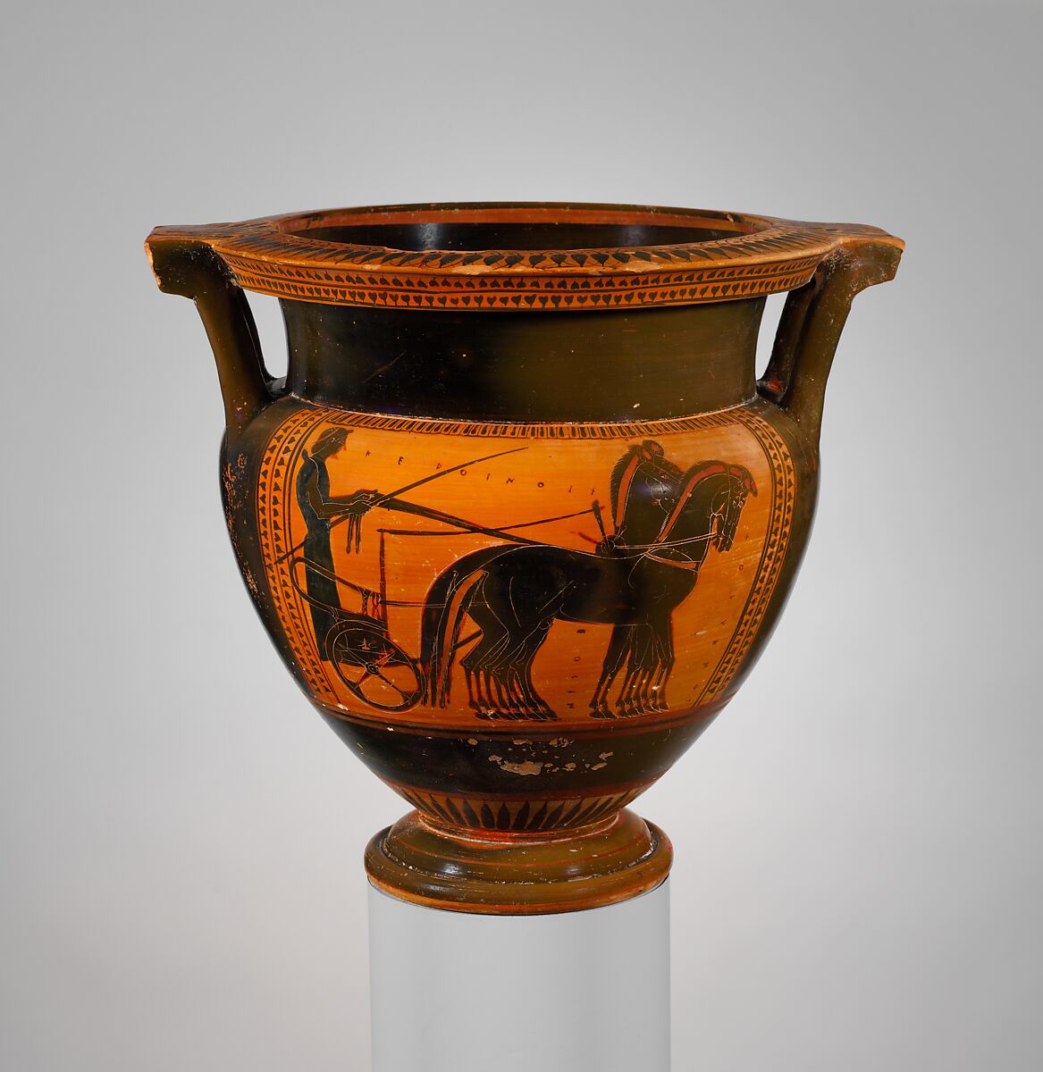 The chariot race was the most prestigious event at all the Panhellenic games held in Greece. Only the wealthiest could afford the four-horse chariot with professional driver needed to enter the competition. This picture of a quadriga ready to depart must have pleased the symposiasts whose wine was mixed in the krater.