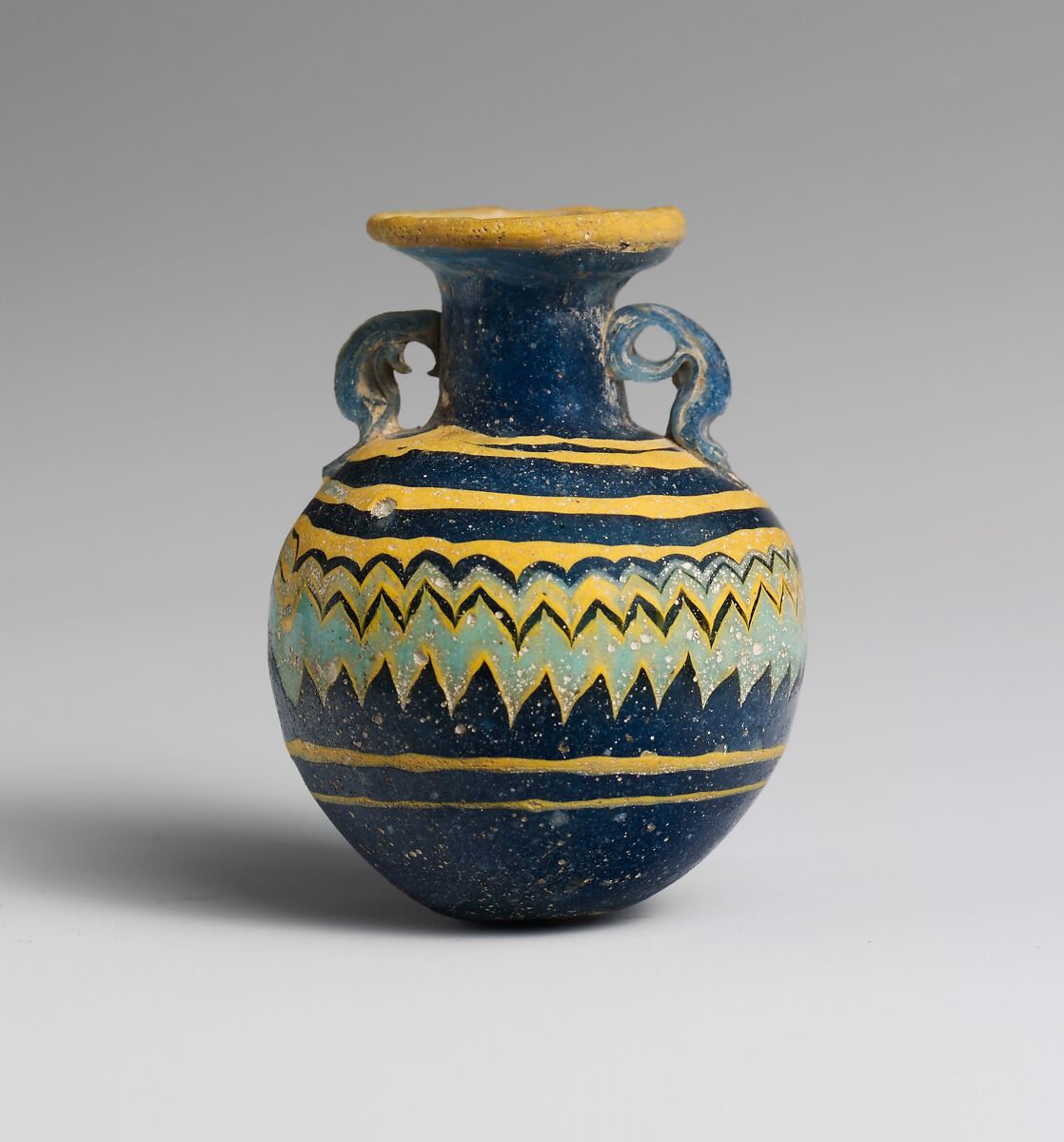 Yellow trail applied to outer edge of rim-disk; another yellow trail applied unevenly on shoulder and wound spirally down, at first in horizontal lines, then tooled into a close-set zigzag pattern around central section of body; turquoise blue trails applied over yellow, also forming part of the zigzag pattern; below this, a yellow trail wound horizontally twice around body.