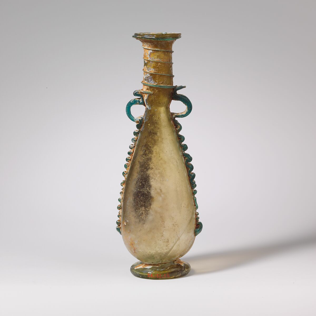 Outsplayed rim, folded over and in, with beveled outer edge; cylindrical neck, tooled in at base; elongated, slender piriform body; tubular base ring made by folding; pushed-in bottom with thick pontil scar; two rod handles applied as long trails on sides of body, drawn up to just below junction with neck, then drawn out, up, and in as loops, and pressed onto lower part of neck over trail.