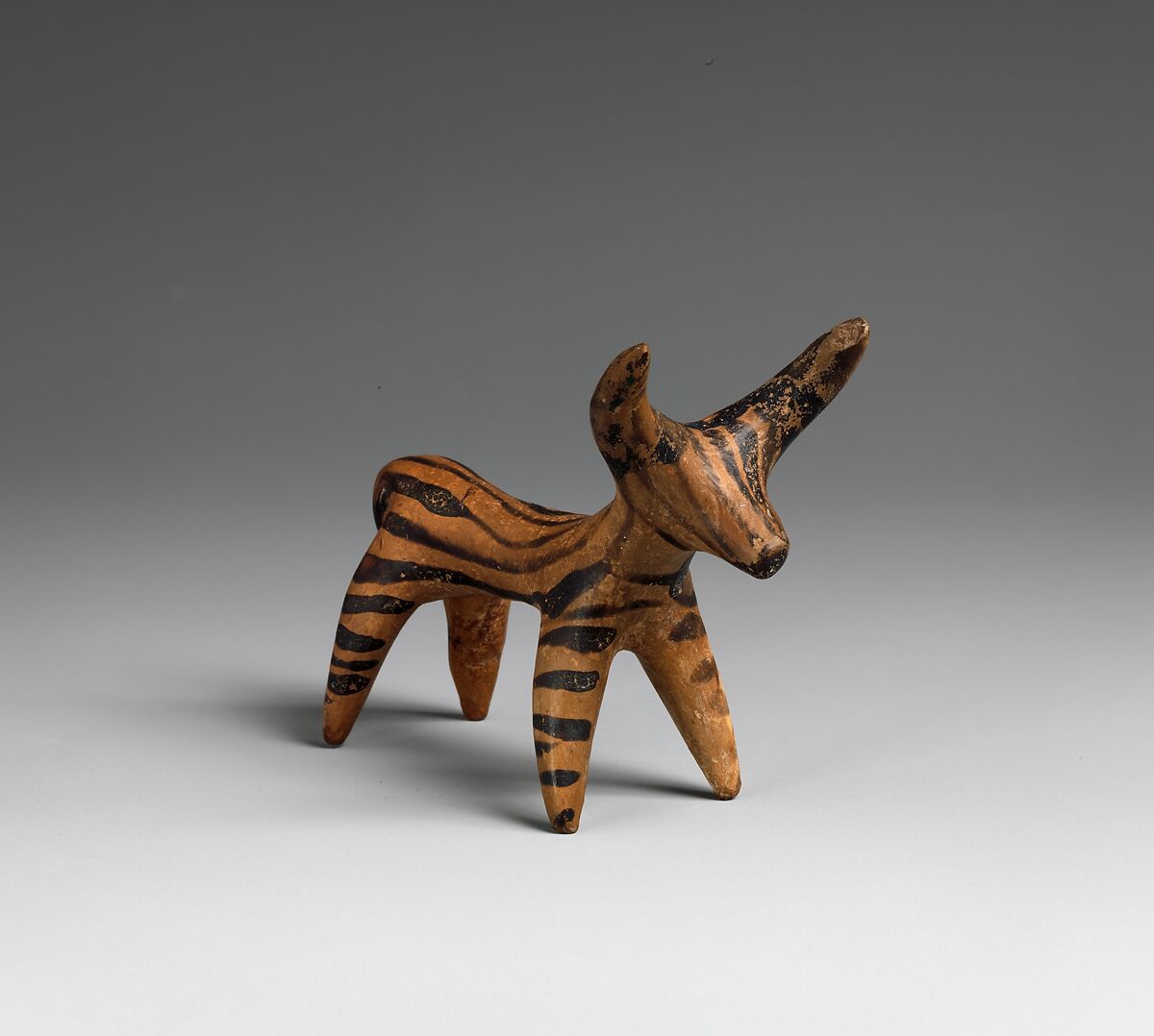 Bulls were especially prominent among the animals represented in Mycenaean terracotta sculpture. Formidable beasts that were also a valuable source of meat, they embodied strength, fertility, and divine power. They were prized for their use in agriculture and played an important role in Mycenaean religion. Bull statuettes frequently served as votive offerings to a deity, reflecting a desire to communicate with the divine through a prestigious, if symbolic, gift.