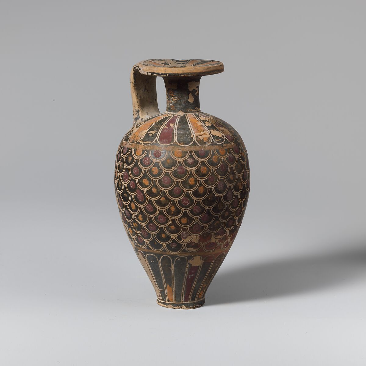 This vase is representative of the mastery achieved by Corinthian artists of the seventh century B.C. There is utmost precision in both the potting and the execution of the scale pattern.