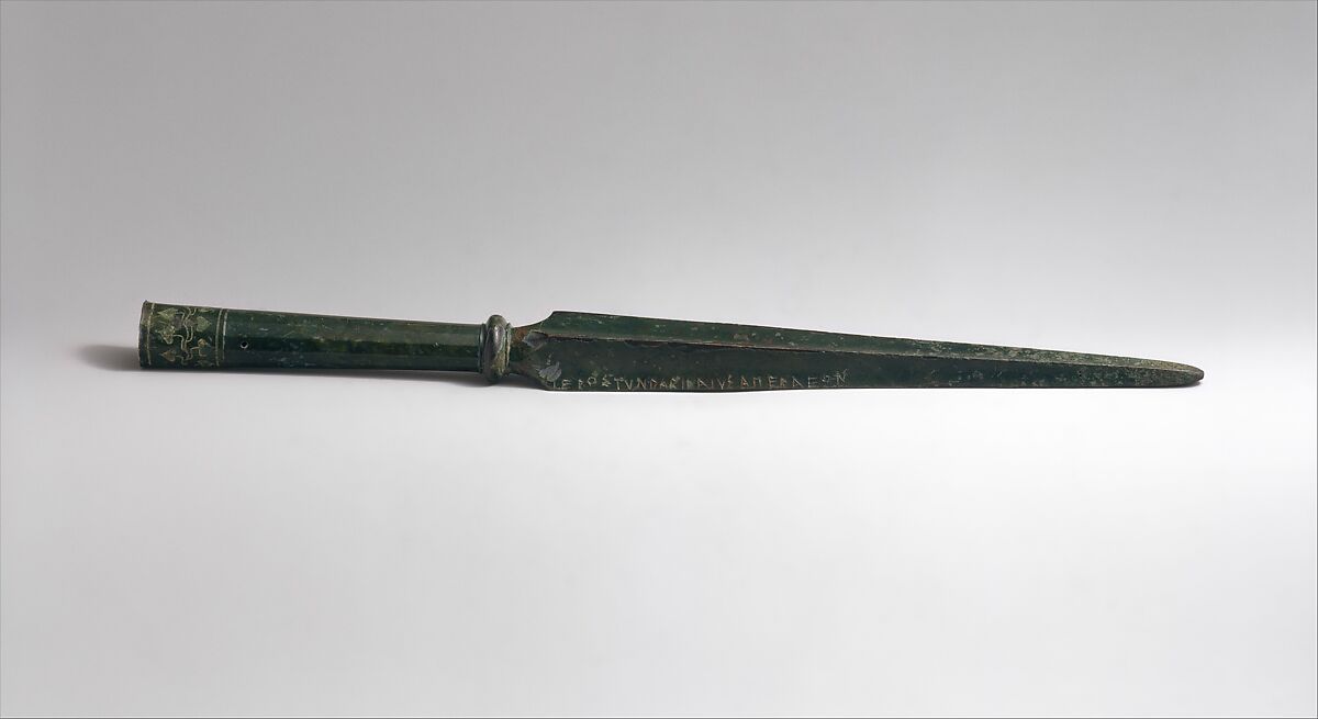 A spear-butt covers the end of a spear that touches the ground. This particularly fine example bears the inscription sacred to the Tyndaridai from the Heraeans. The Tyndaridae are Kastor and Polydeukes. The Heraeans are the inhabitants of a city in Arkadia from whom the spear-butt was taken as part of the victors' booty.