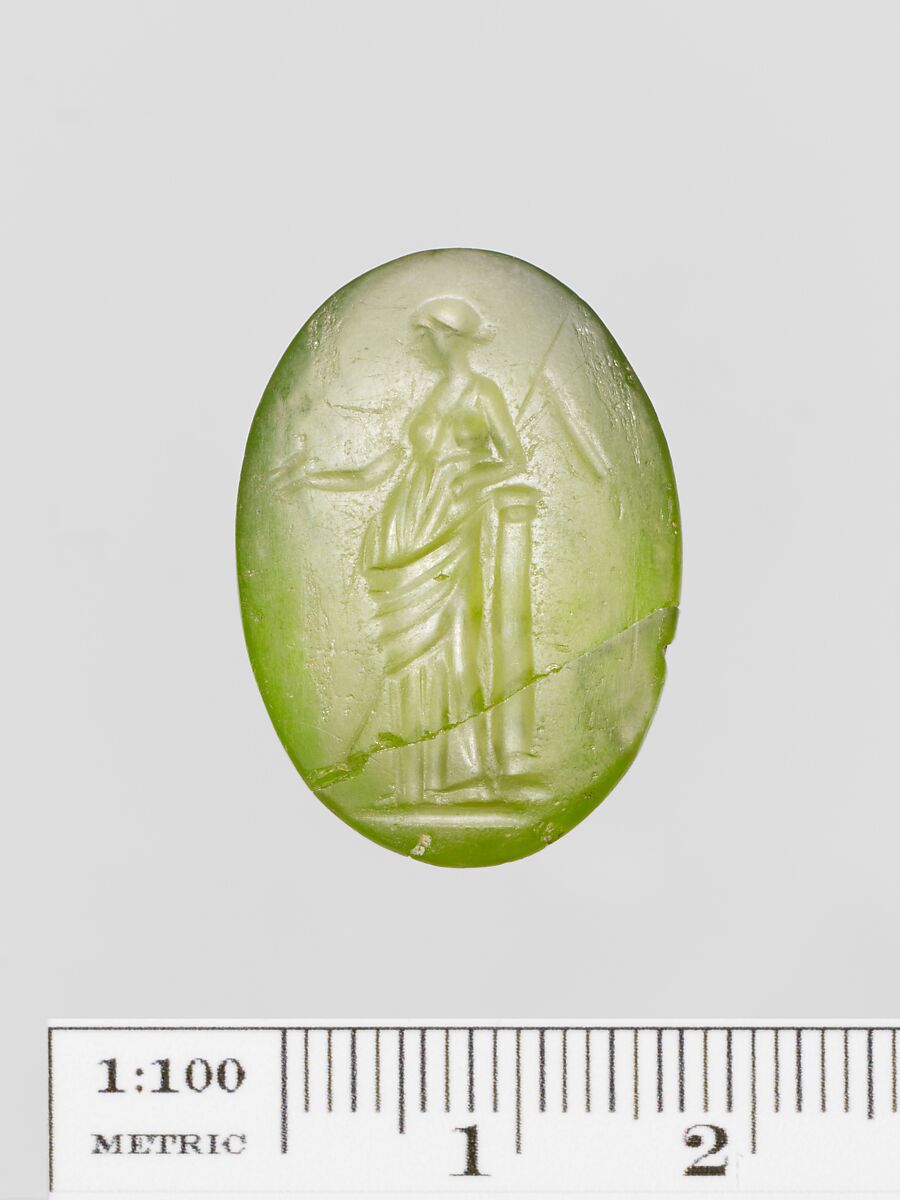 Muse sitting on a rock holding a lyre; Aphrodite leaning on a column holding a scepter and a dove