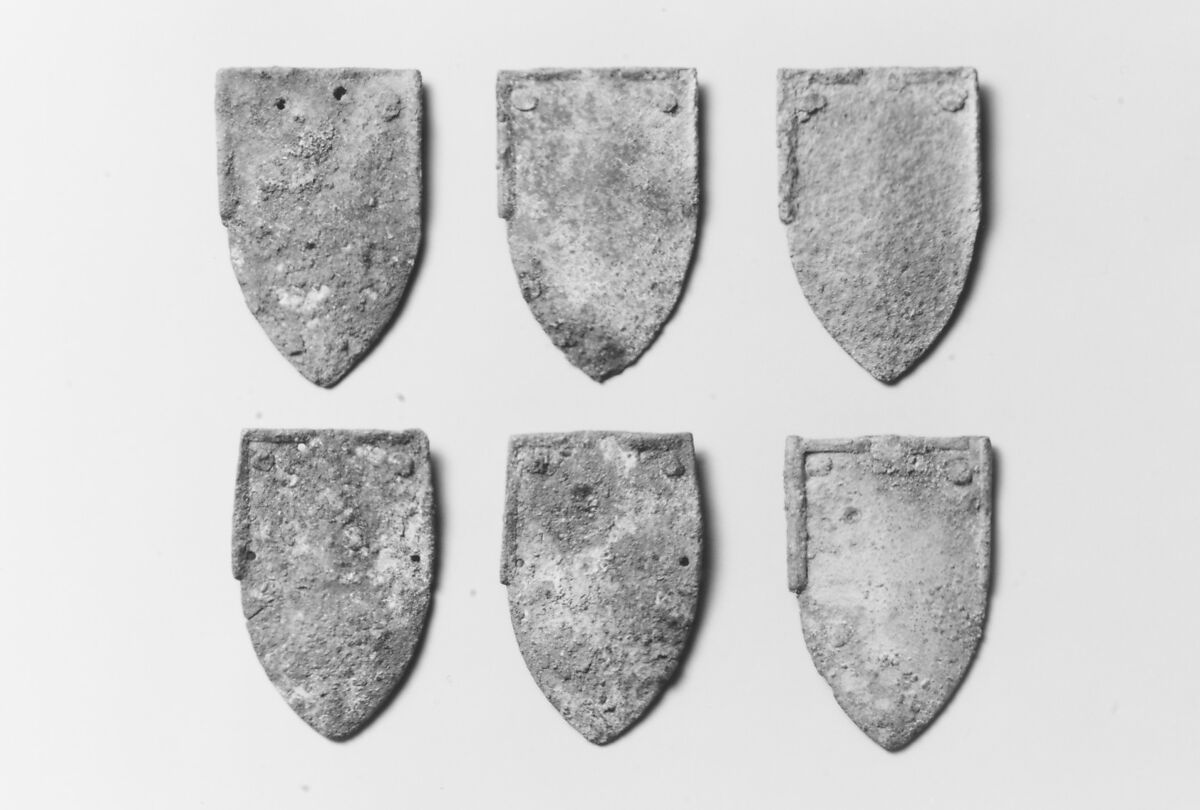 These six scales come from a group of approximately three to four hundred recovered from a region of New Mexico that the Spanish explored and later colonized during the sixteenth and seventeenth centuries. Originally the scales would have been riveted in an overlapping pattern, like shingles, to the outside of a leather or textile jacket (traces of fiber, apparently wool, remain under some of the rivet heads). They are important because there is otherwise very little evidence for the use of scale armor in the New World. Scale armor was largely obsolete in Europe by the time of the colonization of the American Southwest.
