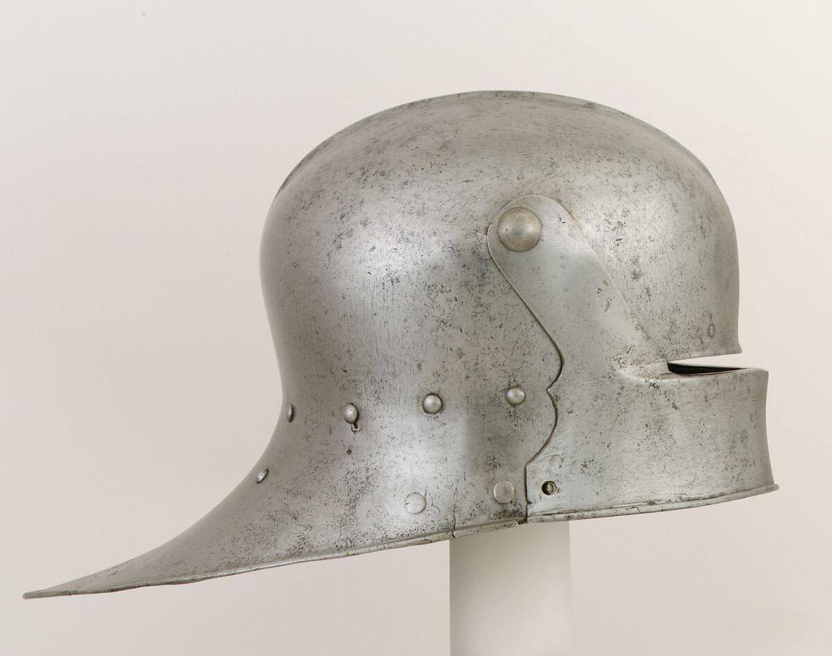 The wide, flat comb suggests that this sallet is a late example dating to the end of the fifteenth century. The visor has been modified or may be associated. The tail is unusually long and spatulate and is struck with two marks: that of the city of Nuremberg and an armorer's mark in the shape of a horseshoe enclosing a letter, possibly that of Hans Grünewalt (ca. 1440–1503).