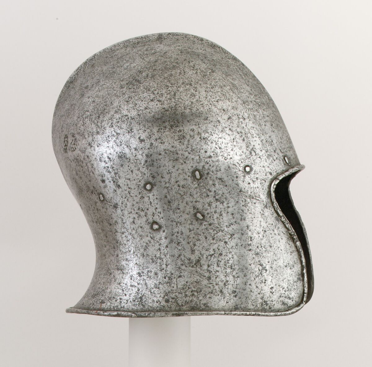 The term sallet (from the Italian celata) is applied to a wide variety of fifteenth-century helmets that have open faces or, if visored, leave the lower face and neck exposed. This tall form of sallet is typically Italian and is sometimes referred to as a barbute. It is struck twice on the right side at the back with the same armorer's mark: two Gothic letters ("SS" or "SZ") beneath a split-legged cross. Struck on the right cheek is the lion of Saint Mark, a control mark that perhaps denotes the helmet's former presence in the Venice arsenal.