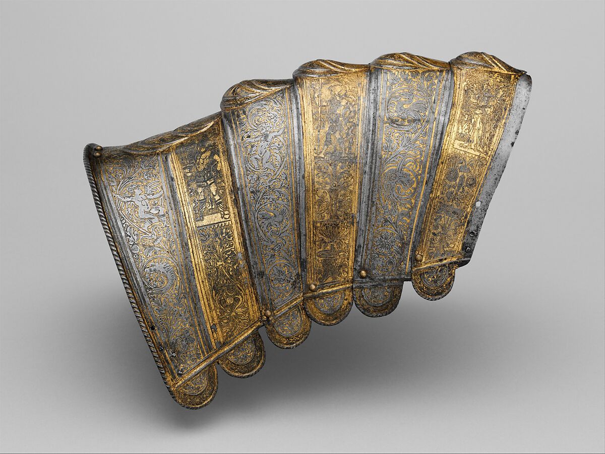 This splendid fragment, etched overall and richly gilt, must have belonged to one of the most magnificcent Brescian horse armors of the sixteenth century. It consists of five plates forming the rear half of a crinet that originally must have comprised ten or more plates; the poor alighment of the plates indicates that they are not in their original order. The inverted, U-shaped plates are embossed along the medial ridge with backward-overlapping scales etched with foliage. The sides of each plate are etched in alternating designs. One pattern consists of foliate scrolls inhabited by birds, grotesque creatures, and nude putti (with and without wings), the ornament left white against a plain recessed and gilt ground. The other comprises symmetrical, vertically aligned candelabra ornament consisting of vases or foliage, trophies of arms, and platforms supporting images of warriors or allegorical figures. All the designs are gilded and executed againts a dotted ground. The lowest crinet lame, which is etched with two panels of alternating pattern, ends with a boldly turned and roped edge. The lower edges of the plates terminate in semicircular scales, each having a roped edge bordered by a sunken band etched with foliage on a dotted ground. The centers of the scales are etched with flowers, trophies, or a mask left white on a plain recessed and gilt ground.