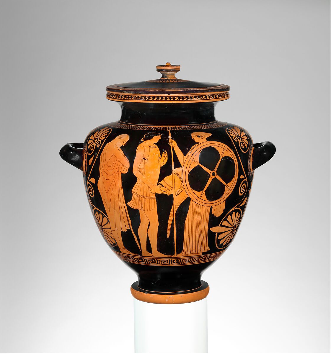 The subject matter of the obverse is indicated by the woman who is handing the warrior his armor. In Homer's Iliad, Thetis, the mother of Achilles, replaces the original armor that Achilles gave to his friend Patroklos. This side probably depicts the principal Greek hero of the Trojan War, while the other indicates the cause of the war, the desire of Menelaos, the king of Sparta, to reclaim his wife from Paris, the Trojan prince. The fluid execution of the figures is complemented by the superb handle ornaments.