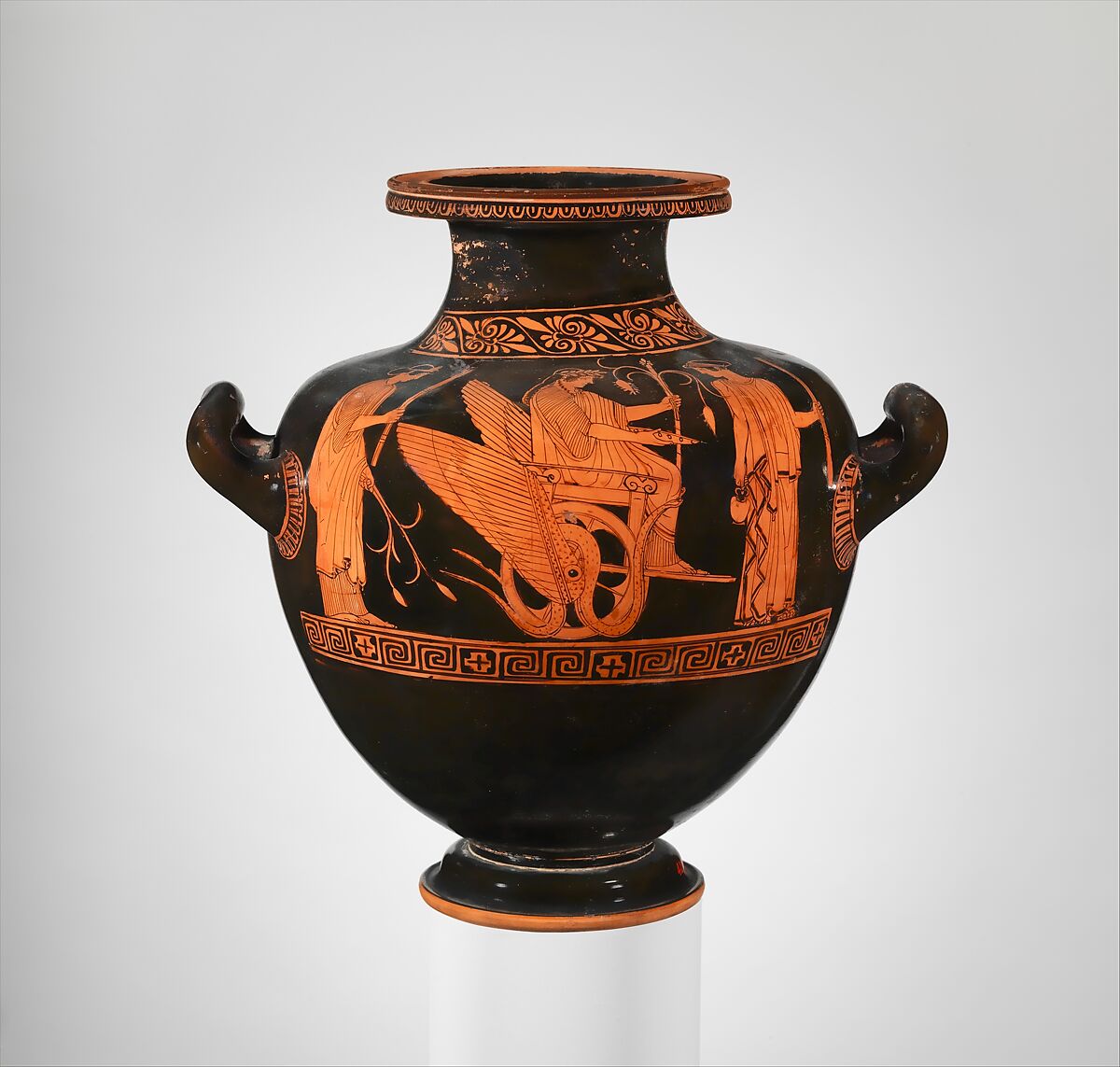 The Niobid Painter ranks with the Villa Giulia Painter as one of the preeminent artists of the second quarter of the fifth century B.C. The Niobid Painter is remembered particularly for mythological representations on large pots. Here, on a smaller scale, he depicts Triptolemos being dispatched by the goddess Demeter, the patroness of fertility and agriculture, and her daughter, Persephone, to teach the cultivation of grain to humanity. The great attraction of this legend—to the artist and the viewer—lies in the winged car that transports Triptolemos. The model here comes "loaded" with snakes.