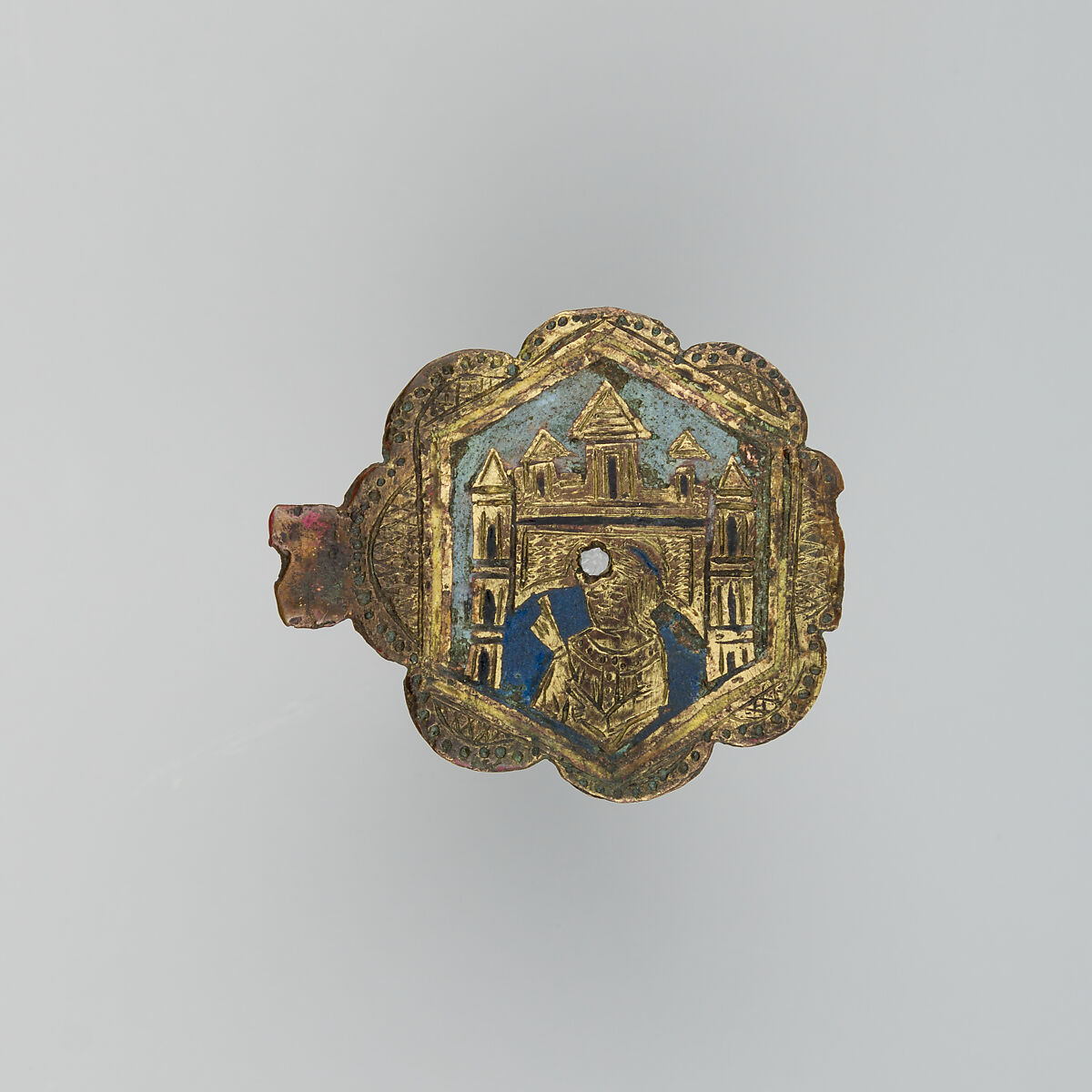 Heraldry, or coat-of-arms, were vitally important in Europe throughout the Middle Ages and the Renaissance. Heraldic emblems were used to identify noble families, cities, regions, and even countries. In addition to being displayed on shields and flags, heraldry was incorporated into architectural decoration on the interior and the exterior of buildings, on furniture, works of art, clothing, and horse equipment. Harness pendants, like this example, would have been attached to a headstall, bridle, or other straps making up the tack of a horse ridden by a nobleman or noblewoman, or a member of their household. Many harness pendants also have decoration that is simply ornamental, or have symbols that are not specifically heraldic in nature.