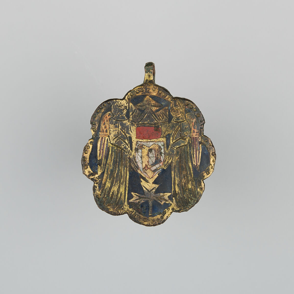 Heraldry, or coat-of-arms, were vitally important in Europe throughout the Middle Ages and the Renaissance. Heraldic emblems were used to identify noble families, cities, regions, and even countries. In addition to being displayed on shields and flags, heraldry was incorporated into architectural decoration on the interior and the exterior of buildings, on furniture, works of art, clothing, and horse equipment. Harness pendants, like this example, would have been attached to a headstall, bridle, or other straps making up the tack of a horse ridden by a nobleman or noblewoman, or a member of their household. Many harness pendants also have decoration that is simply ornamental, or have symbols that are not specifically heraldic in nature.