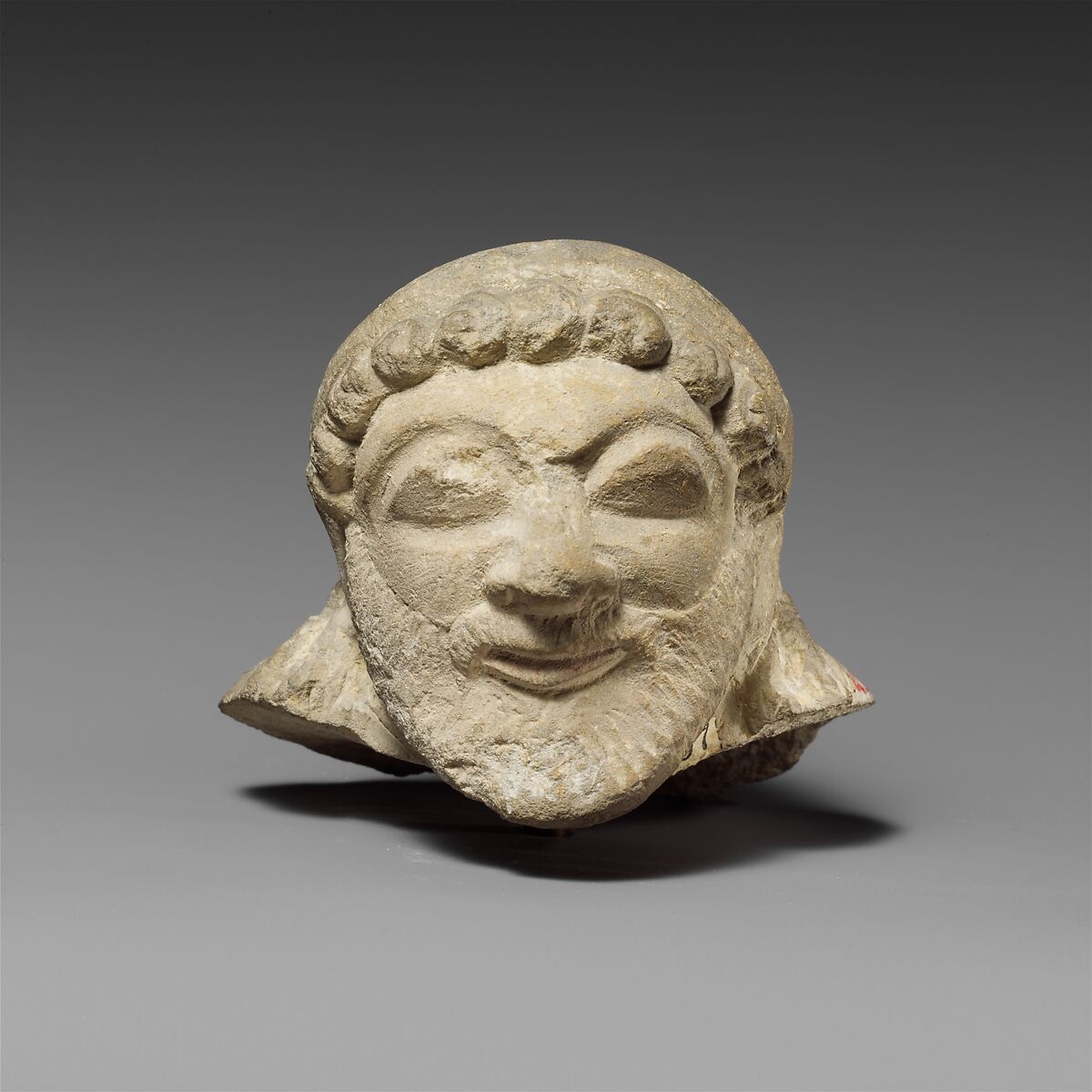 The top of the back shows that the figure was leaning forward, with shoulders hunched. The pointed beard is separated into incised strands; the mustache falls to the sides.