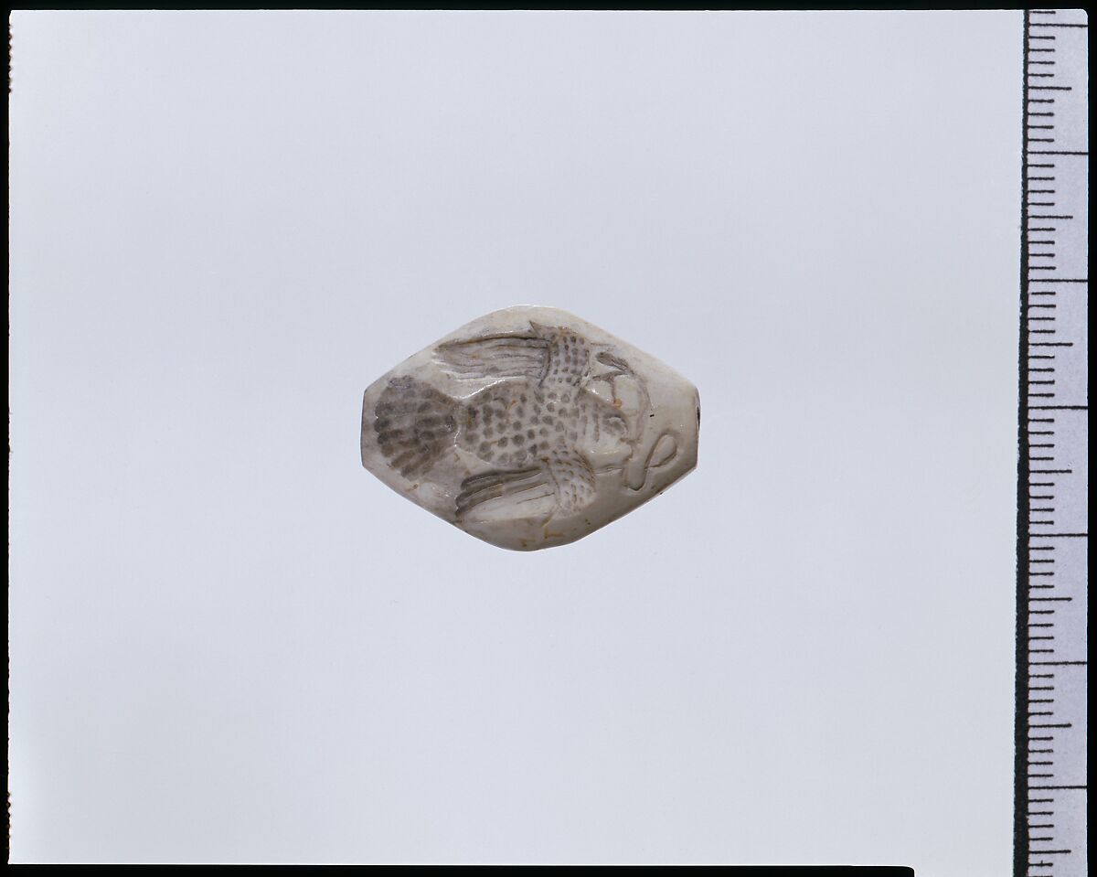 Flying bird with a snake in its beak; the body, wings and tail are drawn full font as if seen from above, the head in profile.
