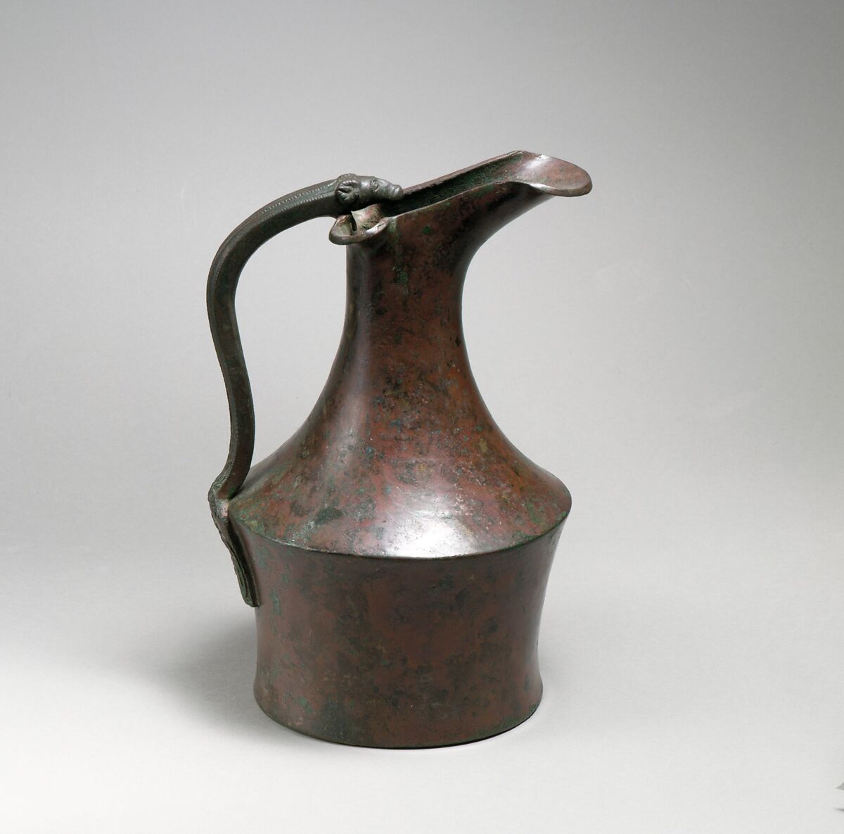 This type of jug, with sharply pronounced shoulder and beak spout, is often found with a basin or patera with a figural handle, objects that may have been used in a hand-washing ritual. The type began to appear in Etruscan tombs as early as the first quarter of the fifth century B.C. and remained popular until the late fourth century B.C. This example has a ram's head at the upper attachment and a plaque with a fallen warrior at the bottom one. The adjacent plaque (43.11.5) comes from a similar piece.