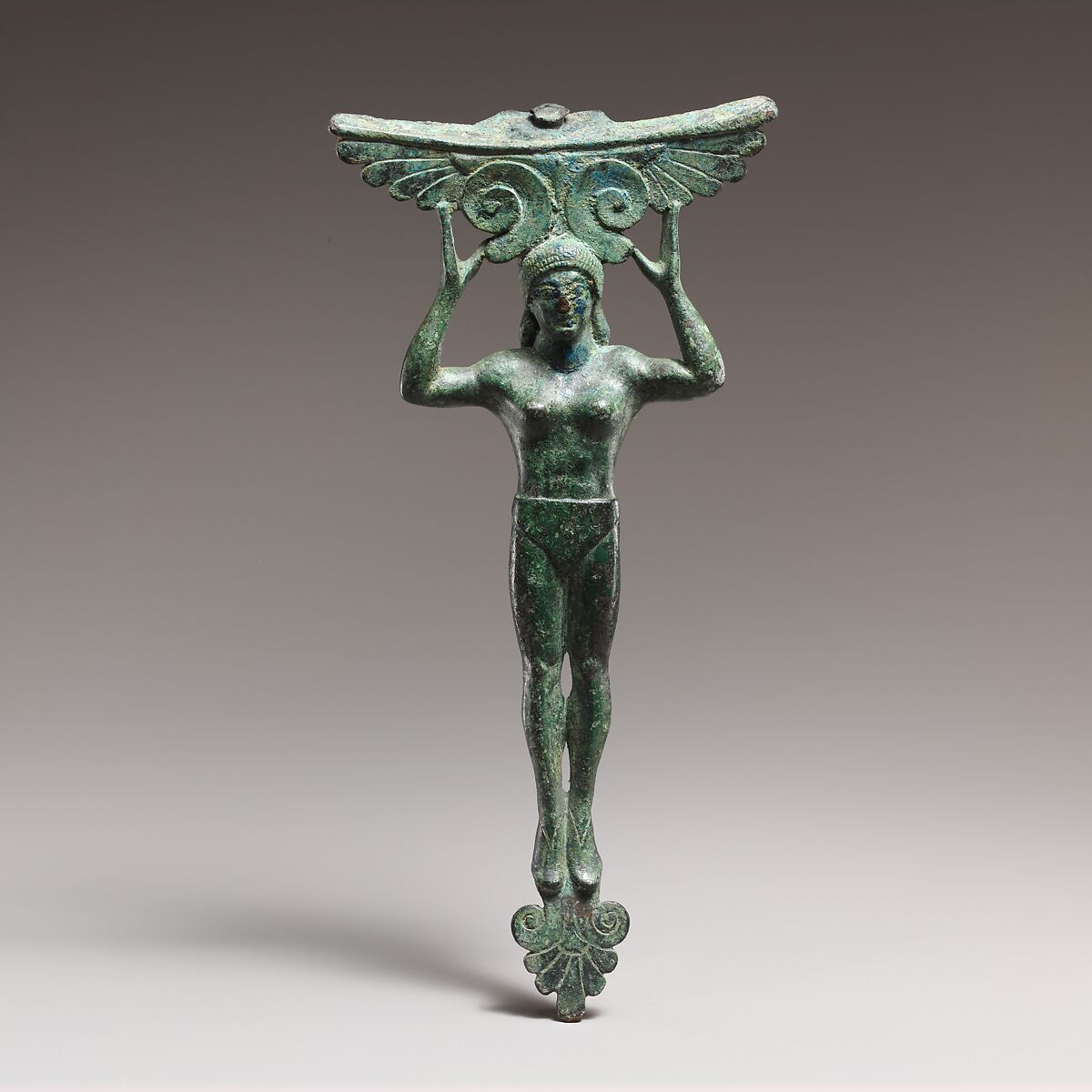 A patera is a shallow bowl, which in Greek art of the late sixth through mid-fifth century B.C., typically has a handle in the form of a human figure. Males predominate, but this is one of two examples in The Metropolitan Museum of Art that show a woman, indicated by her shorts. She also wears shoes. The figure is probably an athlete.