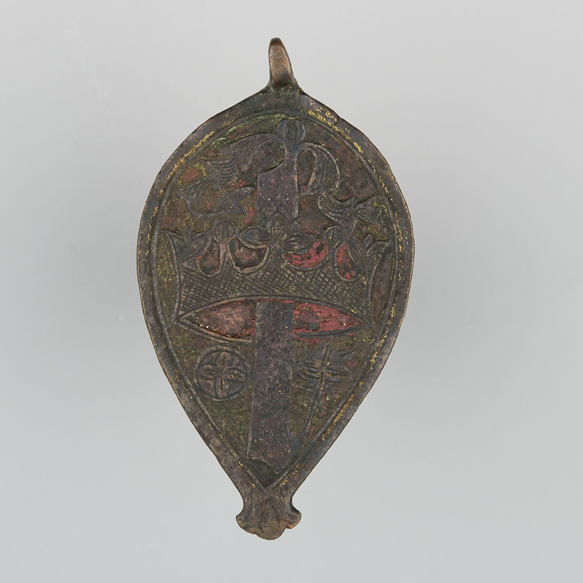 Heraldry, or coat-of-arms, were vitally important in Europe throughout the Middle Ages and the Renaissance. Heraldic emblems were used to identify noble families, cities, regions, and even countries. In addition to being displayed on shields and flags, heraldry was incorporated into architectural decoration on the interior and the exterior of buildings, on furniture, works of art, clothing, and horse equipment. Harness pendants, like this example, would have been attached to a headstall, bridle, or other straps making up the tack of a horse ridden by a nobleman or noblewoman, or a member of their household. Many harness pendants also have decoration that is simply ornamental, or have symbols that are not specifically heraldic in nature.