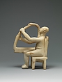This figure of a seated man playing a harp is among the earliest of the few known Cycladic representations of musicians. With its balanced proportions and engaging sense of movement, it is one of the most accomplished examples. The artist used the limited tools available with great technical skill. The harp’s extremely delicate arch was achieved by gently grinding down the stone with natural abrasives such as sand, pumice, and emery.
