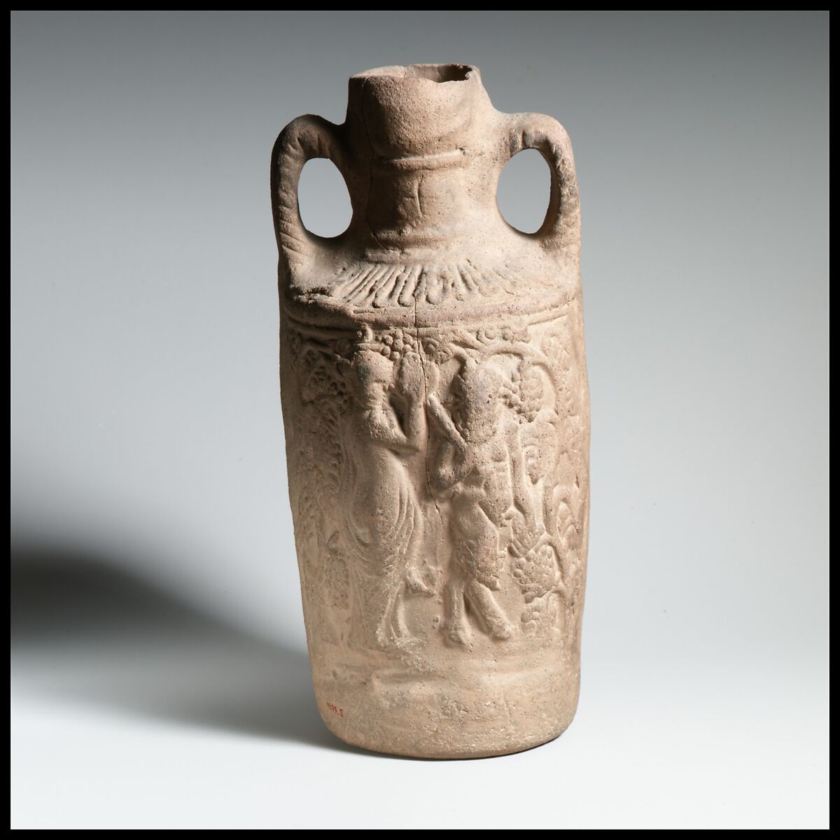 This vessel was made at Cnidus, a trading and manufacturing port in Caria (southwestern Turkey), famed for its statue of Aphrodite by the Greek sculptor Praxiteles. The relief decoration shows the god Dionysus on one side and Pan with a dancing nymph on the other. Similar scenes can also be found on much grander examples of Roman art, such as mosaics and marble sarcophagi.
