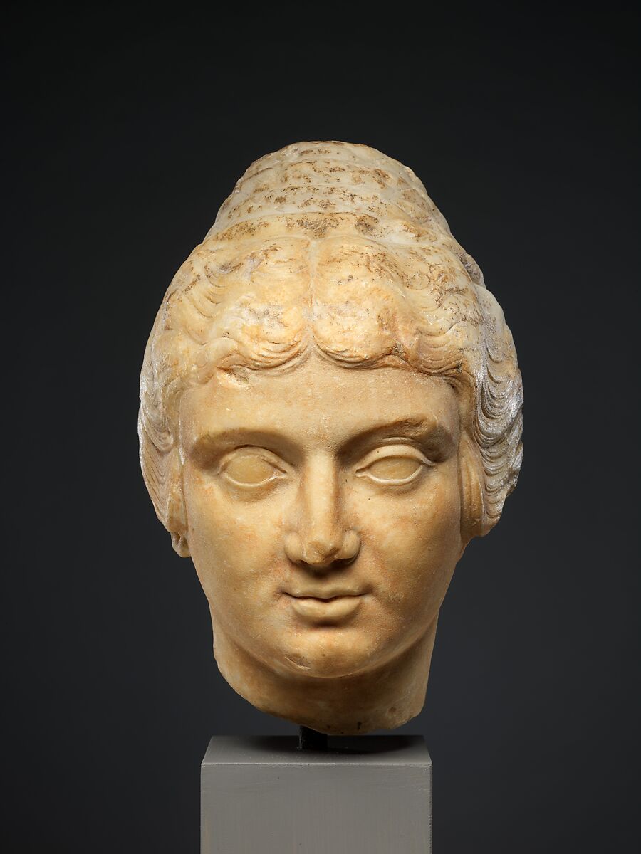 Head of a woman with radical reworking. The places that were reworked are easy to detect by their light color. Where ancient surface survives, the marble is darker and partially covered with accretions.