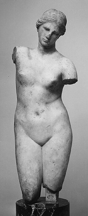 This marble image of Aphrodite, goddess of love and beauty, was originally adorning herself with one arm raised to her hair, the other holding some object like a mirror or ointment vase.