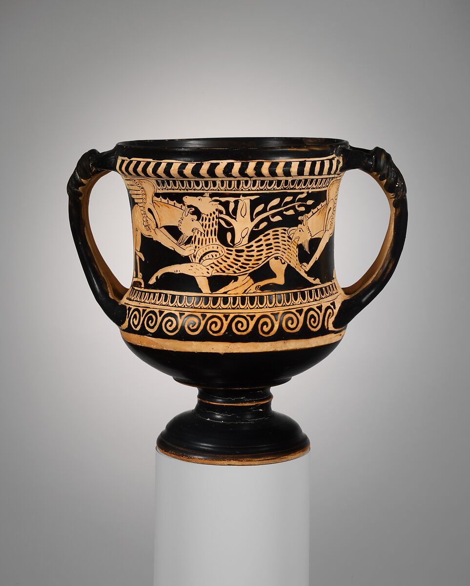The subject of griffins attacking a deer has a long history and remained popular during the Hellenistic period throughout the Mediterranean area. It may be a symbol of the inevitability of death. The handles are ribbon-like and include so-called Herakles knots, a square knot symbolic of love and power in the ancient world. In the Roman Imperial period, Herakles knots were believed to heal wounds.