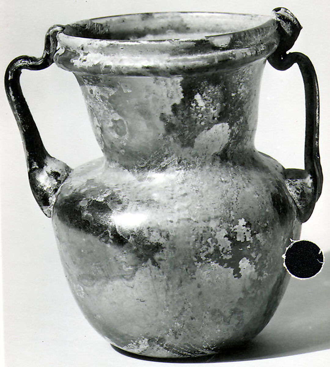 Vertical, rounded, and possibly tubular rim, with projecting horizontal flange below; broad, funnel-shaped neck; uneven shoulder, sloping on one side, horizontal and slightly pushed-in on the other; body with convex side, tapering downward; concave bottom, with small, circular pontil scar; two handles applied in large, thick pads to edge of shoulder, drawn up vertically, turned in and trailed onto flange and then up to top of rim (where one is folded back on itself as a short trail, and the other is broken off).