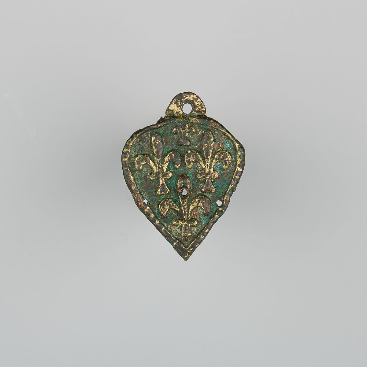 Heraldry, or coat-of-arms, were vitally important in Europe throughout the Middle Ages and the Renaissance. Heraldic emblems were used to identify noble families, cities, regions, and even countries. In addition to being displayed on shields and flags, heraldry was incorporated into architectural decoration on the interior and the exterior of buildings, on furniture, works of art, clothing, and horse equipment. Harness pendants, like this example, would have been attached to a headstall, bridle, or other straps making up the tack of a horse ridden by a nobleman or noblewoman, or a member of their household. Many harness pendants also have decoration that is simply ornamental, or have symbols that are not specifically heraldic in nature.