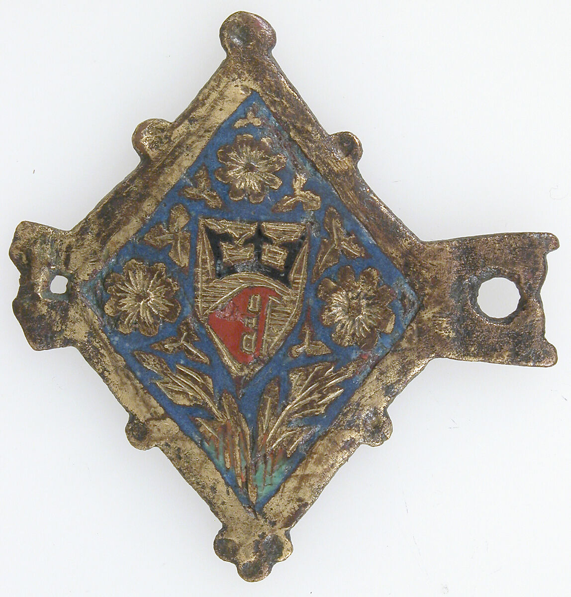 Heraldry, or coat-of-arms, were vitally important in Europe throughout the Middle Ages and the Renaissance. Heraldic emblems were used to identify noble families, cities, regions, and even countries. In addition to being displayed on shields and flags, heraldry was incorporated into architectural decoration on the interior and the exterior of buildings, on furniture, works of art, clothing, and horse equipment. Harness pendants, like this example, would have been attached to a headstall, bridle, or other straps making up the tack of a horse ridden by a nobleman or noblewoman, or a member of their household. Many harness pendants also have decoration that is simply ornamental, or have symbols that are not specifically heraldic in nature.
