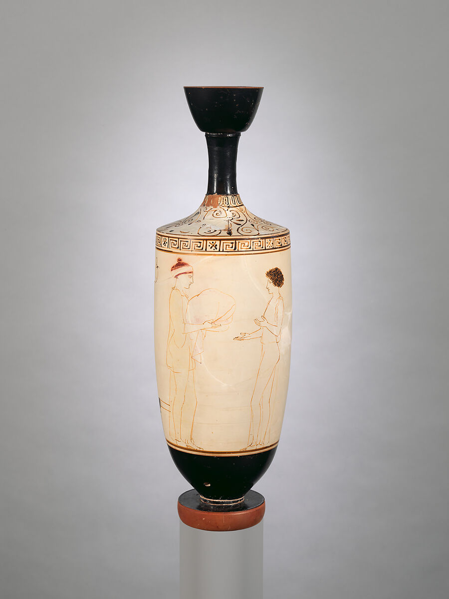 The setting here is the interior of a house, probably the women's quarters an indicated by the stool and the oinochoe (jug) on the wall. The lady hands a bundle of garments to her maid. The women's clothing was originally painted. The color is gone, however, and one now sees the contours that the artist sketched in for reference.