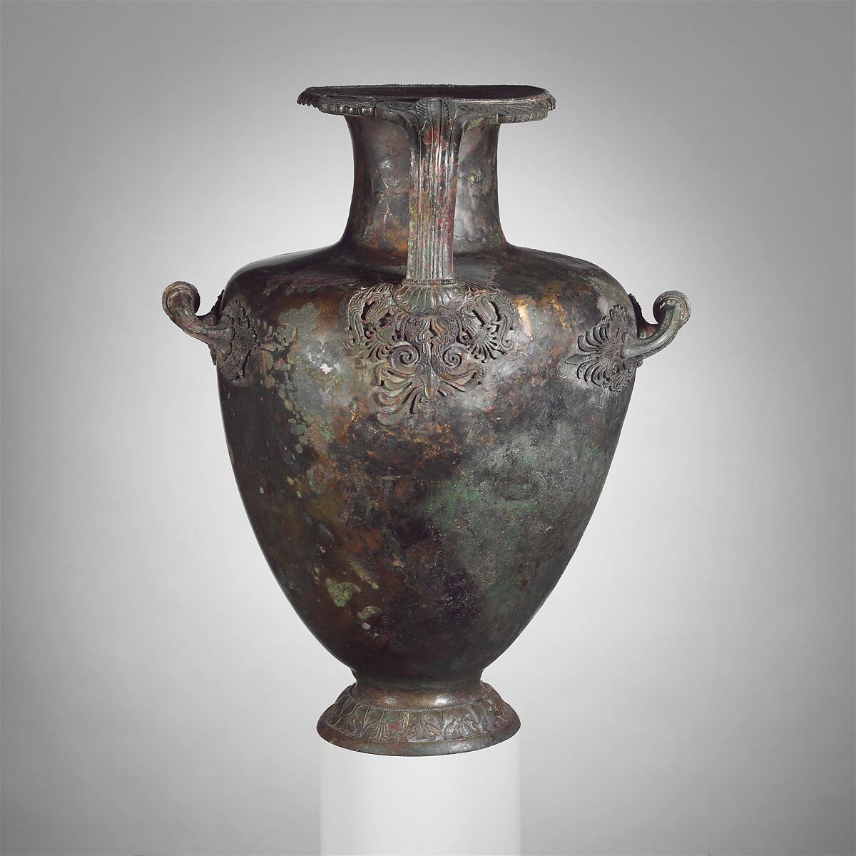 The plaques at the attachments of the side handles and the vertical handle are embellished with palmettes interspersed with other floral motifs. Holes in the lip for the attachment of a lid indicate that the last function of this hydria was as a cinerary urn.