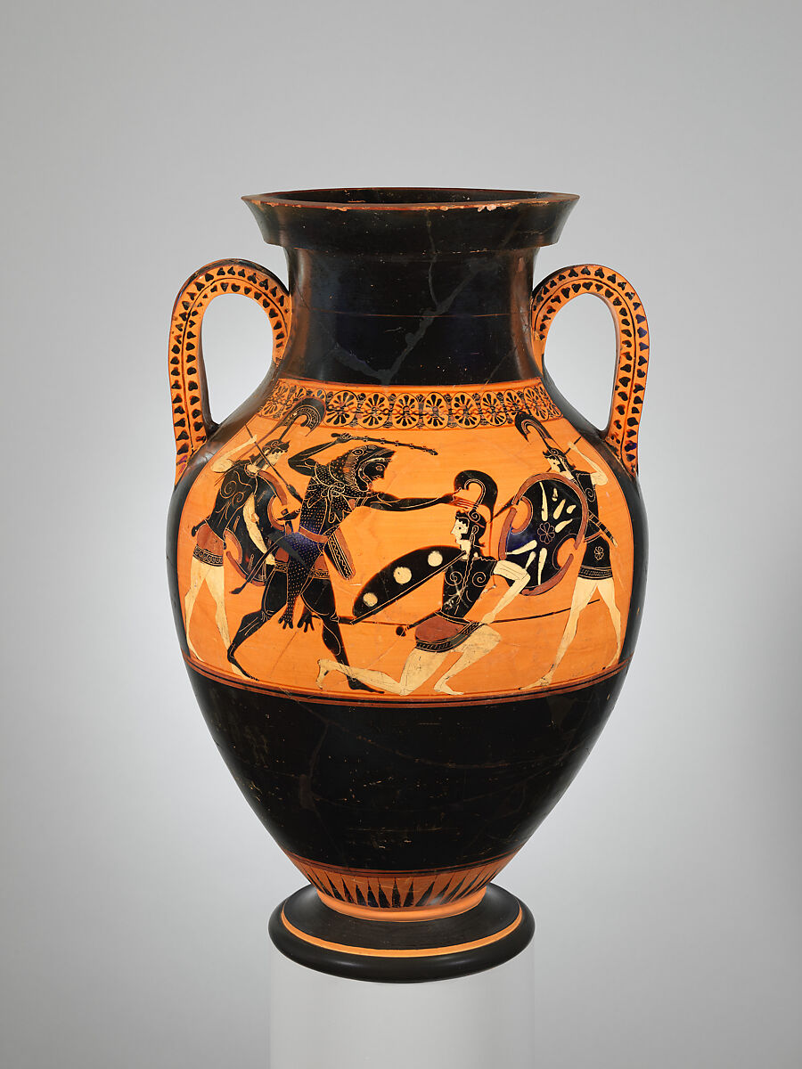 Amazons were mythical women warriors thought to live in a remote region of Asia Minor. One of the twelve labors that Herakles had to perform for his master, King Eurystheus, was to capture the girdle of the Amazon queen Hippolyte. In the fierce battle depicted here, the Amazons are dressed like Greek hoplites (foot soldiers) with helmet, cuirass, and round shield.