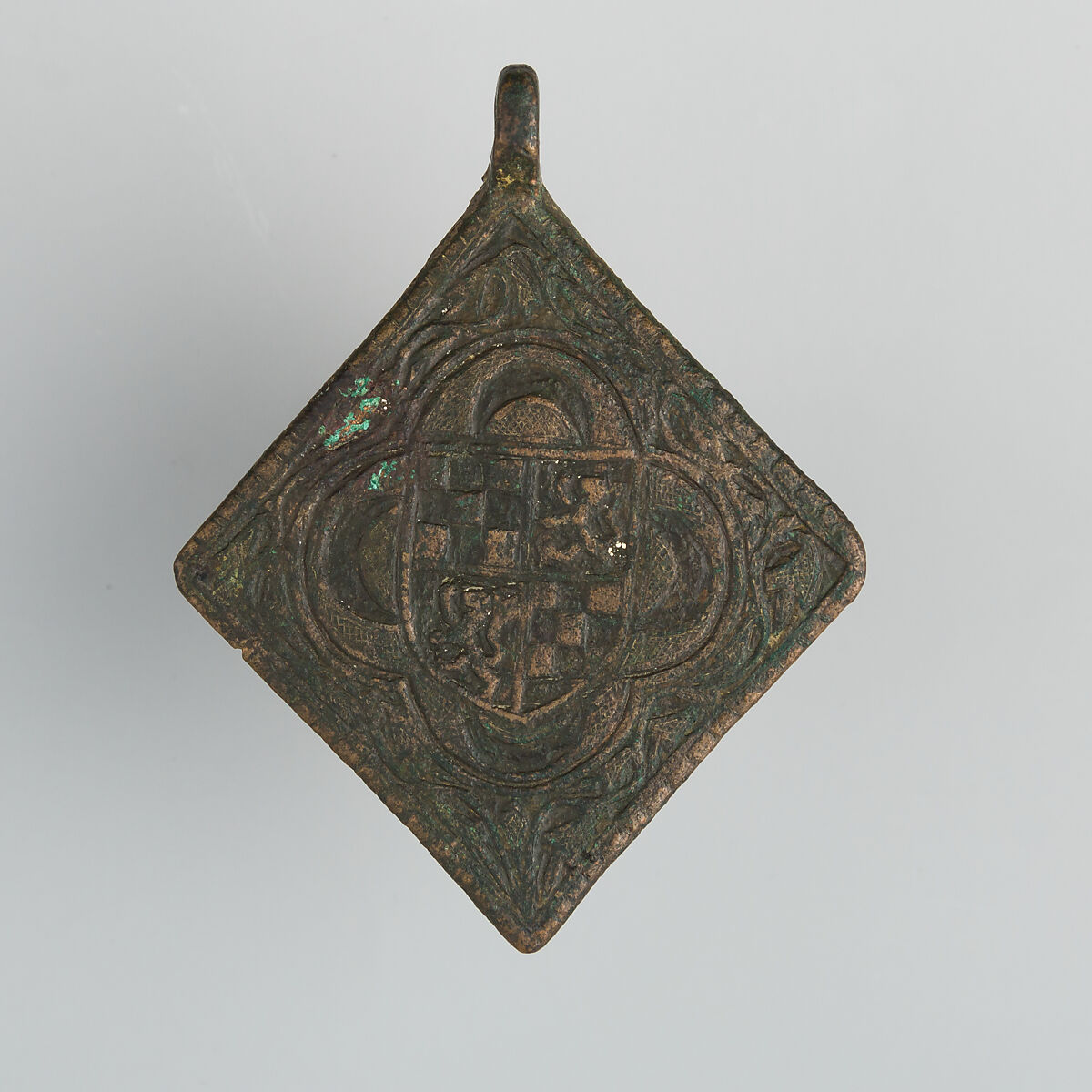 Heraldry, or coat-of-arms, were vitally important in Europe throughout the Middle Ages and the Renaissance. Heraldic emblems were used to identify noble families, cities, regions, and even countries. In addition to being displayed on shields and flags, heraldry was incorporated into architectural decoration on the interior and the exterior of buildings, on furniture, works of art, clothing, and horse equipment. Harness pendants, like this example, would have been attached to a headstall, bridle, or other straps making up the tack of a horse ridden by a nobleman or noblewoman, or a member of their household. Many harness pendants also have decoration that is simply ornamental, or have symbols that are not specifically heraldic in nature.
