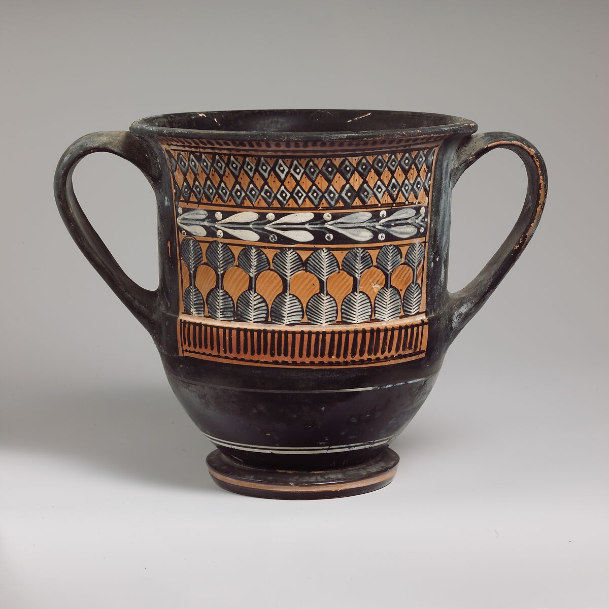 Sessile kantharoi are often decorated with stylized foliate patternwork and other motifs.