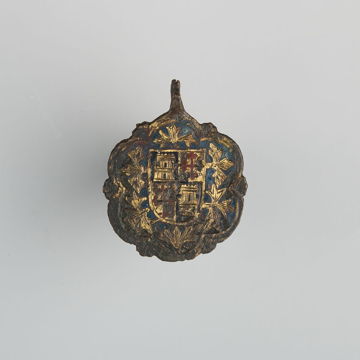 Heraldry, or coat-of-arms, were vitally important in Europe throughout the Middle Ages and the Renaissance. Heraldic emblems were used to identify noble families, cities, regions, and even countries. In addition to being displayed on shields and flags, heraldry was incorporated into architectural decoration on the interior and the exterior of buildings, on furniture, works of art, clothing, and horse equipment. Harness pendants, like this example, would have been attached to a headstall, bridle, or other straps making up the tack of a horse ridden by a nobleman or noblewoman, or a member of their household. Many harness pendants also have decoration that is simply ornamental, or have symbols that are not specifically heraldic in nature.