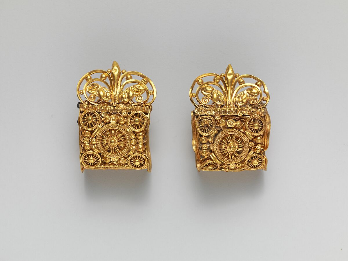 Baule type earrings with symmetrical palmettes embellished with single gold grains at the top, which are flanked by repoussé crouching hares.