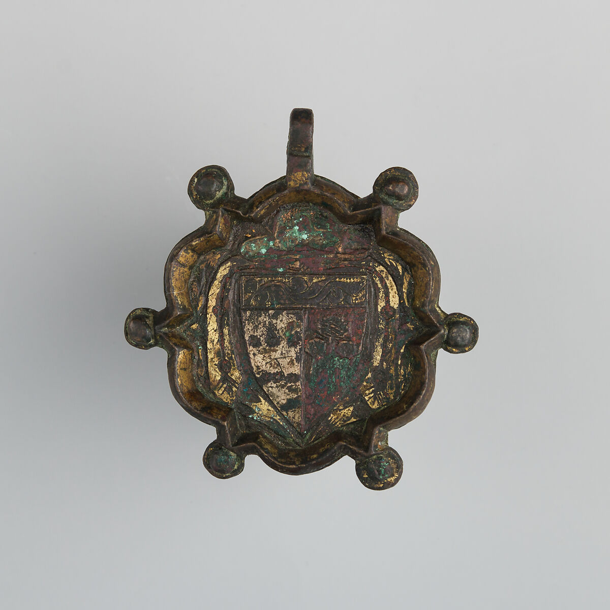 Heraldry, or coat-of-arms, were vitally important in Europe throughout the Middle Ages and the Renaissance. Heraldic emblems were used to identify noble families, cities, regions, and even countries. In addition to being displayed on shields and flags, heraldry was incorporated into architectural decoration on the interior and the exterior of buildings, on furniture, works of art, clothing, and horse equipment. Harness pendants, like this example, would have been attached to a headstall, bridle, or other straps making up the tack of a horse ridden by a nobleman or noblewoman, or a member of their household. Many harness pendants also have decoration that is simply ornamental, or have symbols that are not specifically heraldic in nature.