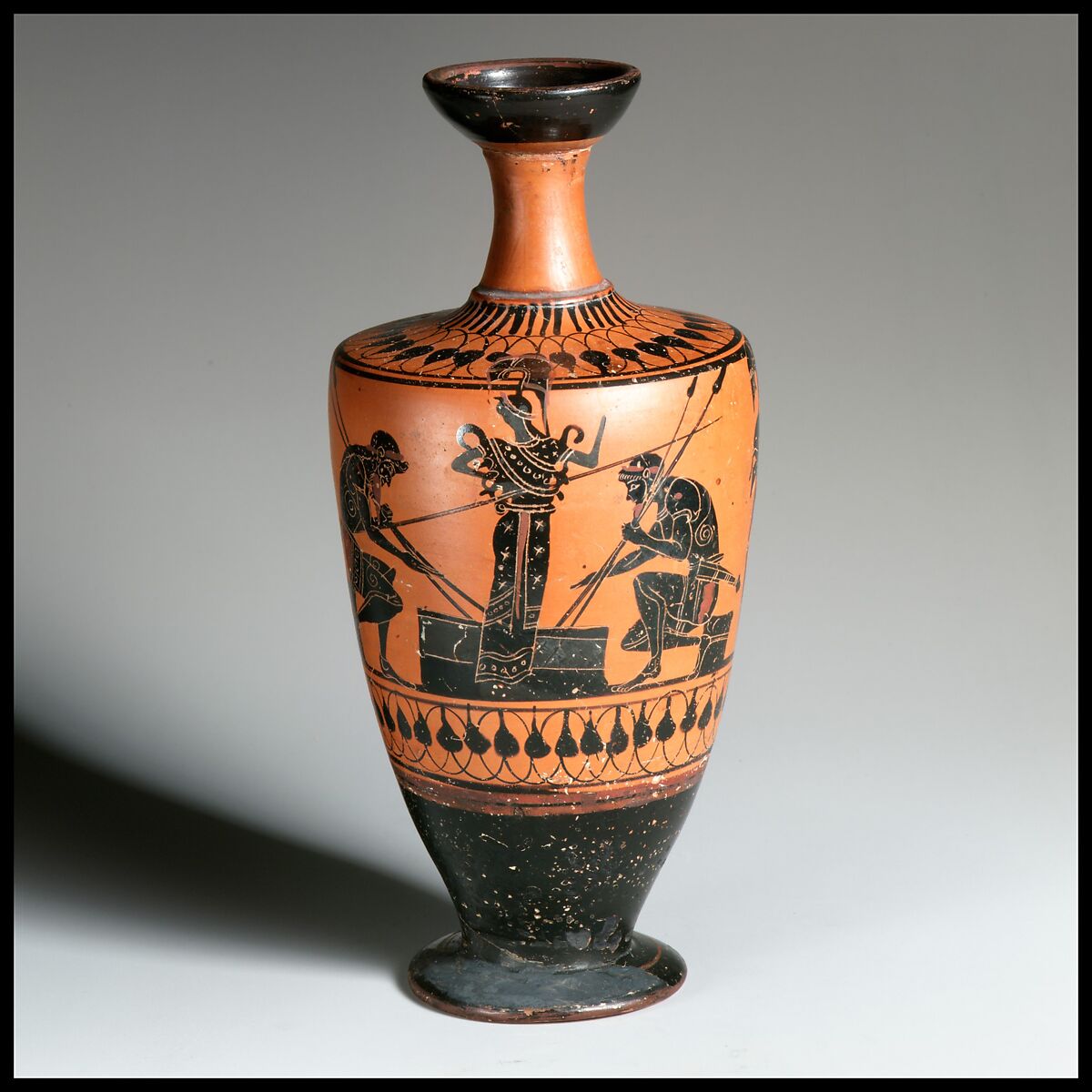 During the second half of the sixth century B.C., a popular subject was that of the Greek heroes Ajax and Achilles playing a board game to while away their time during the siege of Troy. The most famous representation occurs on an amphora now in the Vatican Museums. Exekias, perhaps the greatest black-figure artist, made and painted the amphora, and he may also have invented the iconography. The subject was applied to all manner of other vases, as this representative example indicates.