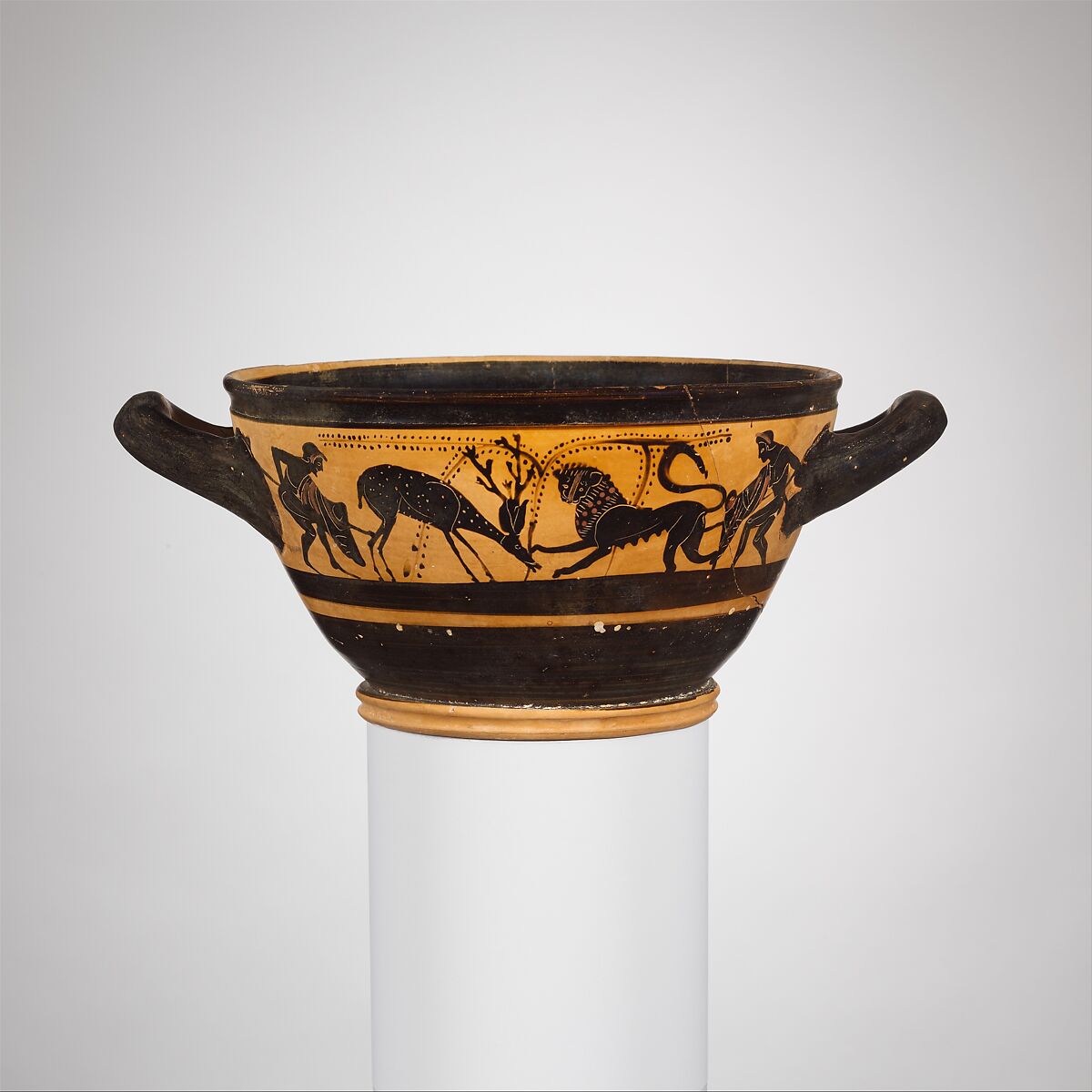 This vase gives noteworthy testimony to the persistence of tradition in Attic vase-painting. Introduced from the Near East and depicted as early as Geometric vases, the motif of a feline felling a bull or deer appears here in mannerly, decorative form. The hunters to either side reflect the predilection for symmetrical compositions with decorative elements, figural or floral, at the handles. The shape of the skyphos readily accommodates the narrative frieze.