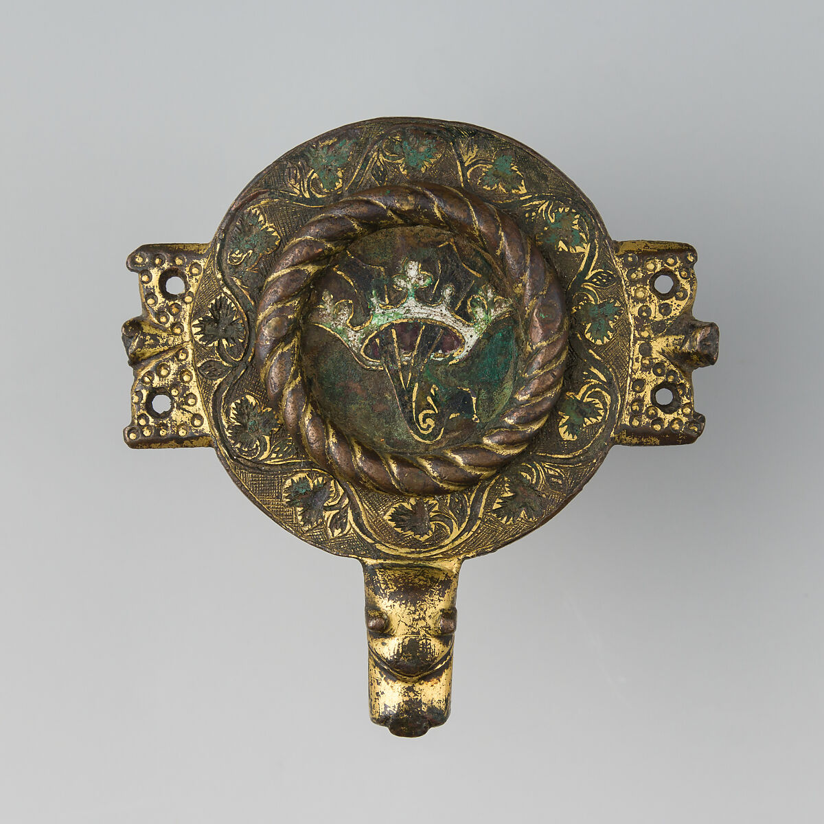 Heraldry, or coat-of-arms, were vitally important in Europe throughout the Middle Ages and the Renaissance. Heraldic emblems were used to identify noble families, cities, regions, and even countries. In addition to being displayed on shields and flags, heraldry was incorporated into architectural decoration on the interior and the exterior of buildings, on furniture, works of art, clothing, and horse equipment. Harness pendants, like this example, would have been attached to a headstall, bridle, or other straps making up the tack of a horse ridden by a nobleman or noblewoman, or a member of their household. Many harness pendants also have decoration that is simply ornamental, or have symbols that are not specifically heraldic in nature.