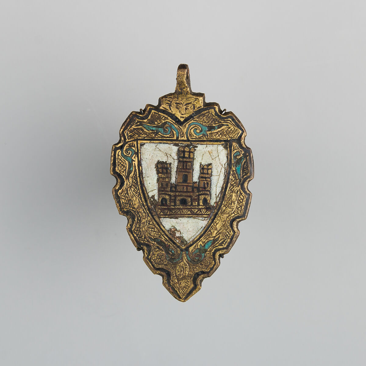 Heraldry, or coat-of-arms, were vitally important in Europe throughout the Middle Ages and the Renaissance. Heraldic emblems were used to identify noble families, cities, regions, and even countries. In addition to being displayed on shields and flags, heraldry was incorporated into architectural decoration on the interior and the exterior of buildings, on furniture, works of art, clothing, and horse equipment. Harness pendants, like this example, would have been attached to a headstall, bridle, or other straps making up the tack of a horse ridden by a nobleman or noblewoman, or a member of their household. Many harness pendants also have decoration that is simply ornamental, or have symbols that are not specifically heraldic in nature.