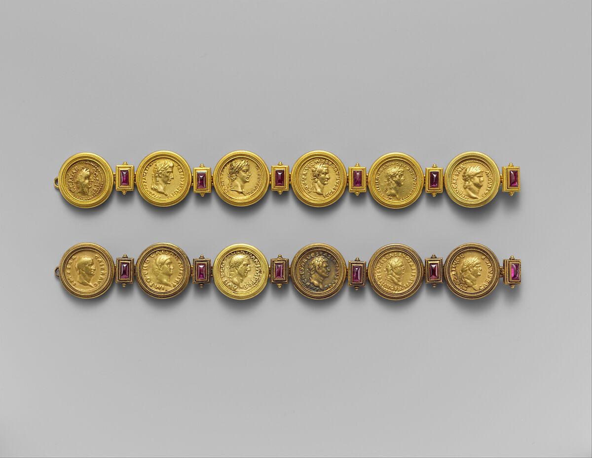The coins are mounted in a matching pair of nineteenth-century gold bracelets that are also decorated with oblong amethysts en cabochon. The jewelry may have been fashioned by the firm of Castellani in Rome and was inspired by the early second-century A.D. writer Suetonius' biographies of the first twelve rulers of imperial Rome, which started with Julius Caesar and ended with Domitian. One bracelet contains aurei of the dictator Julius Caesar and the Julio-Claudian emperors Augustus, Tiberius, Caligula, Claudius, and Nero, the other has coins of the emperors of the civil war in A.D. 69—Galba, Otho, and Vitellius—and the Flavian emperors Vespasian, Titus, and Domitian.