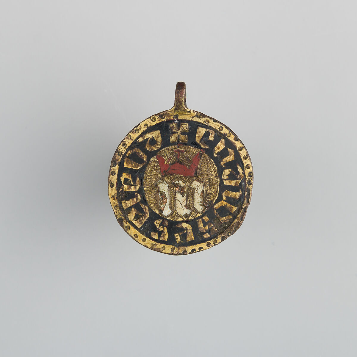 Heraldry, or coat-of-arms, were vitally important in Europe throughout the Middle Ages and the Renaissance. Heraldic emblems were used to identify noble families, cities, regions, and even countries. In addition to being displayed on shields and flags, heraldry was incorporated into architectural decoration on the interior and the exterior of buildings, on furniture, works of art, clothing, and horse equipment. Harness pendants, like this example, would have been attached to a headstall, bridle, or other straps making up the tack of a horse ridden by a nobleman or noblewoman, or a member of their household. Many harness pendants also have decoration that is simply ornamental, or have symbols that are not specifically heraldic in nature.