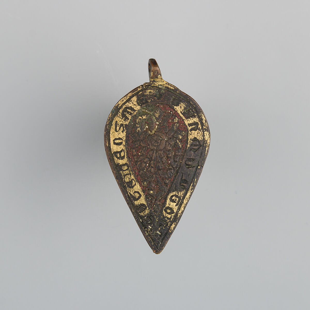 Heraldry, or coat-of-arms, were vitally important in Europe throughout the Middle Ages and the Renaissance. Heraldic emblems were used to identify noble families, cities, regions, and even countries. In addition to being displayed on shields and flags, heraldry was incorporated into architectural decoration on the interior and the exterior of buildings, on furniture, works of art, clothing, and horse equipment. Harness pendants, like this example, would have been attached to a headstall, bridle, or other straps making up the tack of a horse ridden by a nobleman or noblewoman, or a member of their household. Many harness pendants also have decoration that is simply ornamental, or have symbols that are not specifically heraldic in nature.