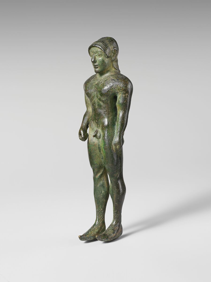 The nudity, short hair, and pose of this youth demonstrate clearly that he represents an Etruscan response to Greek sculptures of the second half of the sixth century B.C. Originally, the figure held something, perhaps a spear or a bow, in his right hand. One characteristic Etruscan feature is that he wears pointed shoes, which are unknown in the related Greek statues.