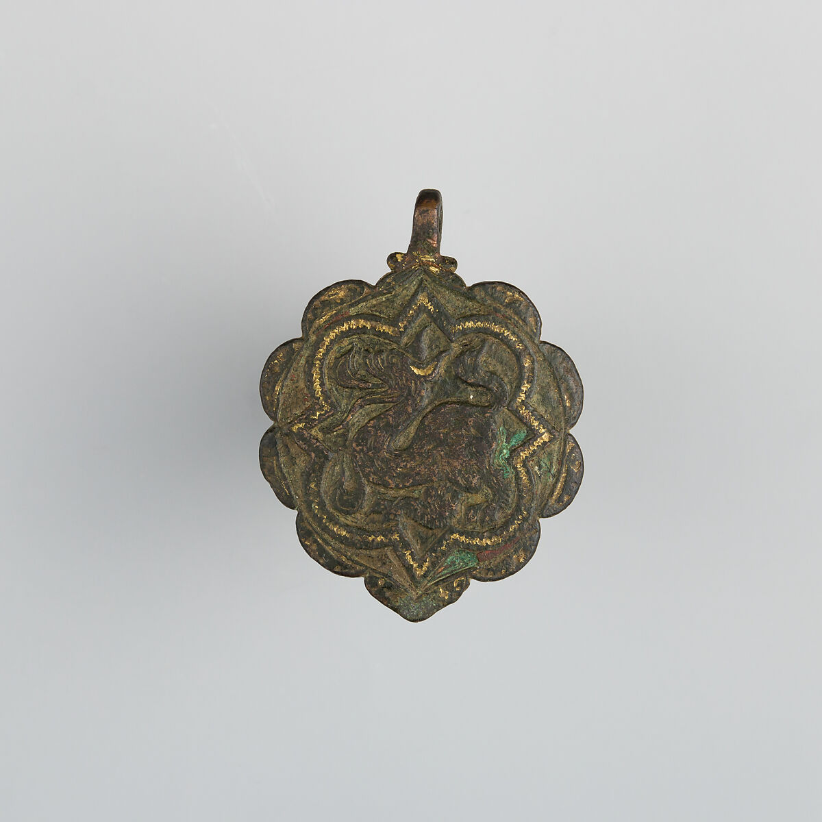 Heraldry, or coat-of-arms, were vitally important in Europe throughout the Middle Ages and the Renaissance. Heraldic emblems were used to identify noble families, cities, regions, and even countries. In addition to being displayed on shields and flags, heraldry was incorporated into architectural decoration on the interior and the exterior of buildings, on furniture, works of art, clothing, and horse equipment. Harness pendants, like this example, would have been attached to a headstall, bridle, or other straps making up the tack of a horse ridden by a nobleman or noblewoman, or a member of their household. Many harness pendants also have decoration that is simply ornamental, or have symbols that are not specifically heraldic in nature.