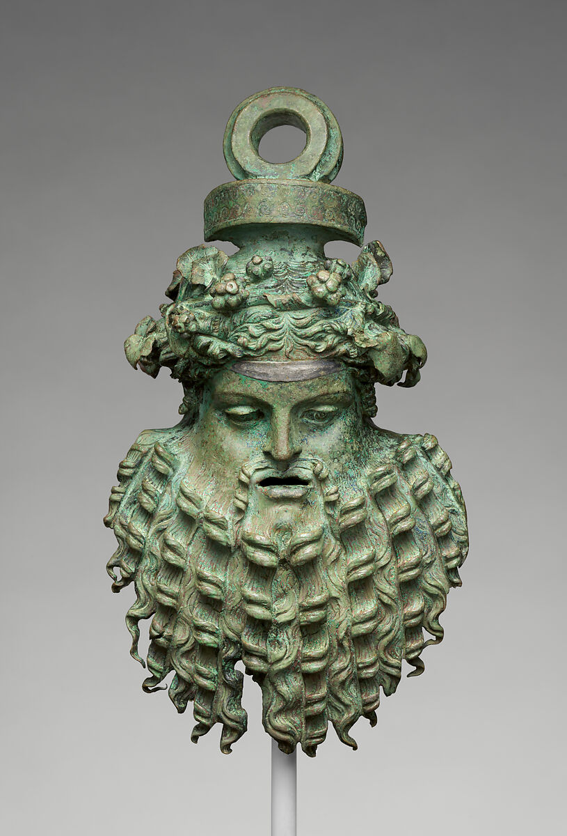 Images related to Dionysos, Greek god of intoxication and ecstasy, were well suited to the luxurious and hedonistic life that wealthy Romans led in their villas. These handle attachments were for wine buckets. The wreath of ivy leaves and the fillet crossing the forehead are associated exclusively with the god of wine and his followers. The mask brings to mind Archaic images of Dionysos, who until the fifth century B.C. was always shown with long hair and a beard. But the pointed, equine ears on these masks mark them as representations of satyrs or silenoi, the quasi-human woodland creatures in the rowdy entourage of the god.