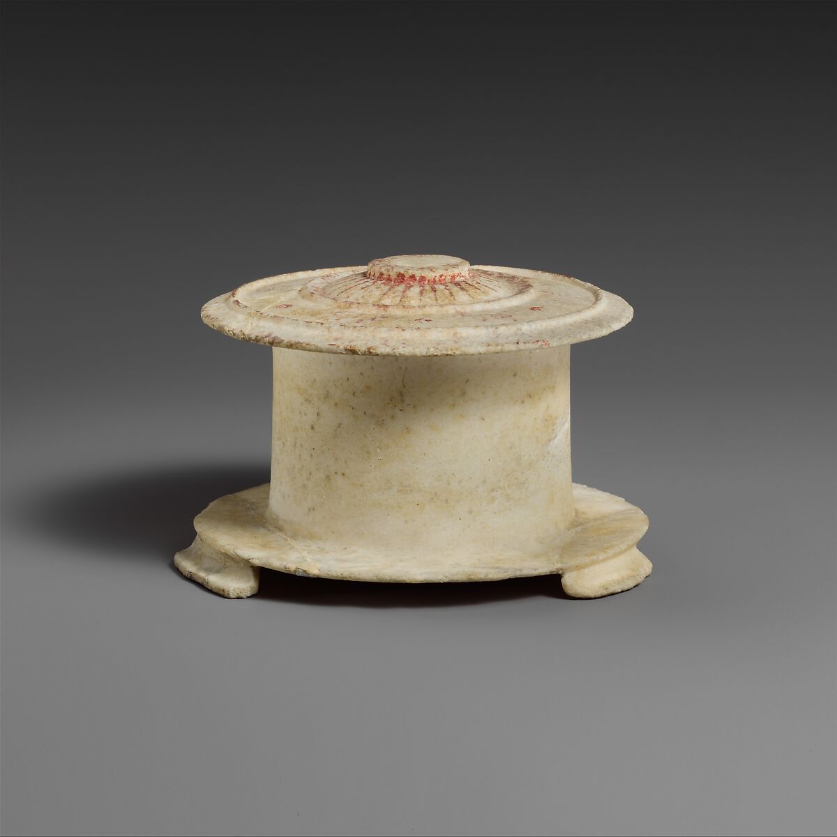 This pyxis is particularly important for the traces of polychromy preserved on the lid. The colors are comparable to those on contemporary terracotta vases and figures.