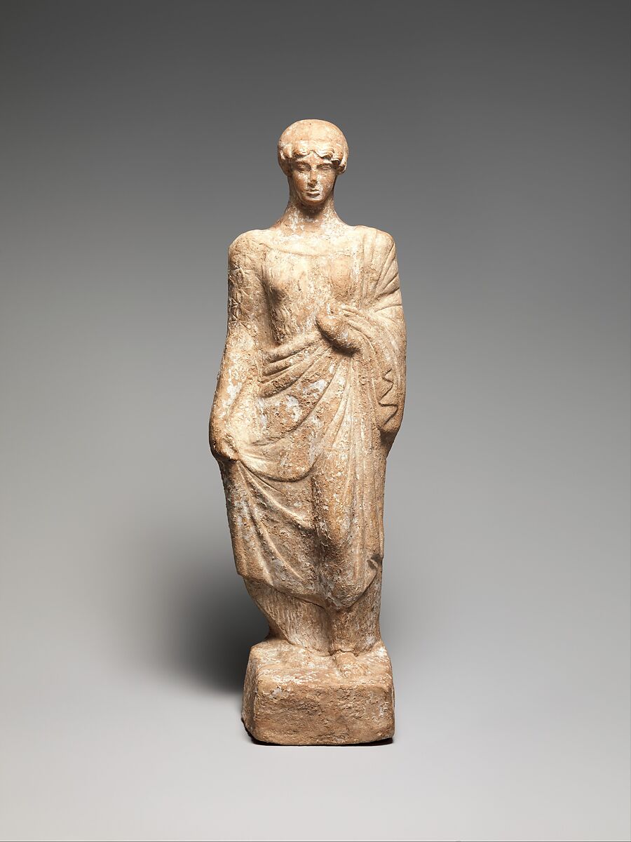 This lovely figure in a finely detailed linen chiton and a thin himation (cloak) probably represents a votary. She pulls the himation out to the side like the Archaic korai (statues of young maidens) from the Athenian Akropolis and may have held a bud in the pierced fingers of her left hand.